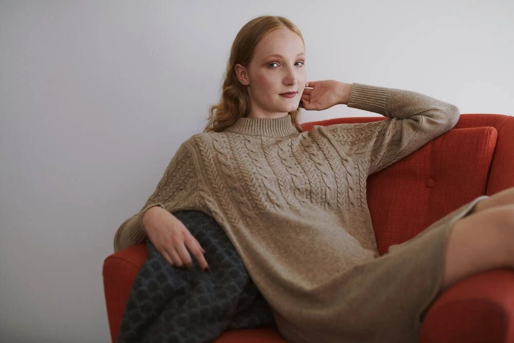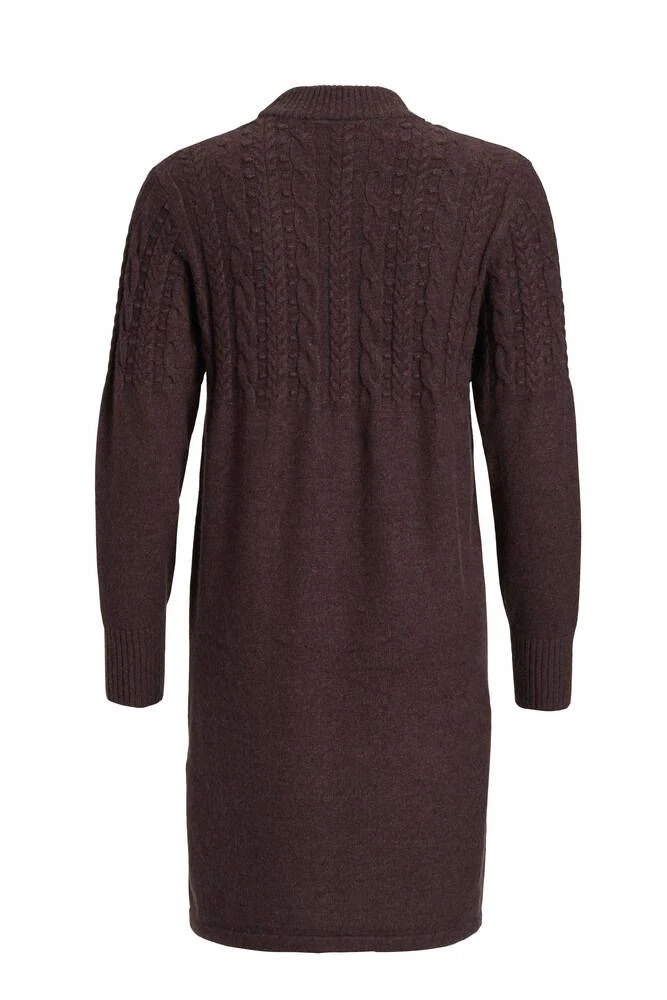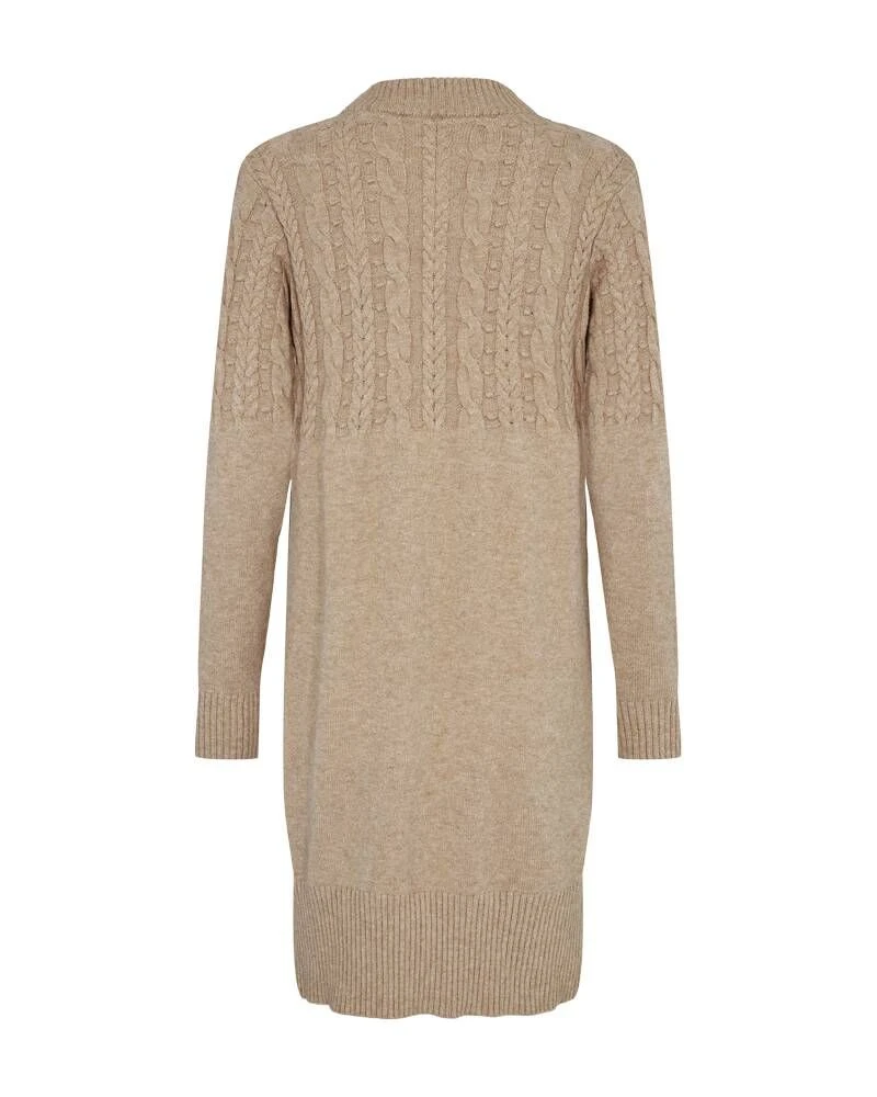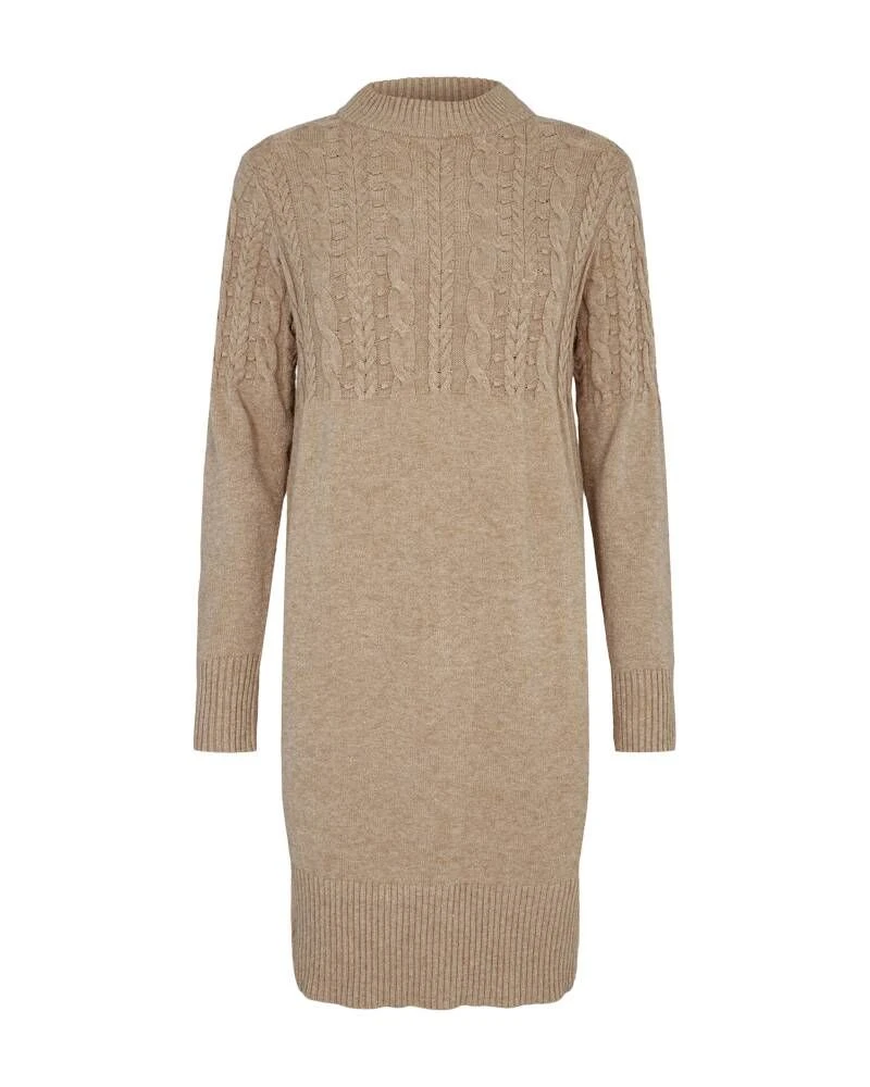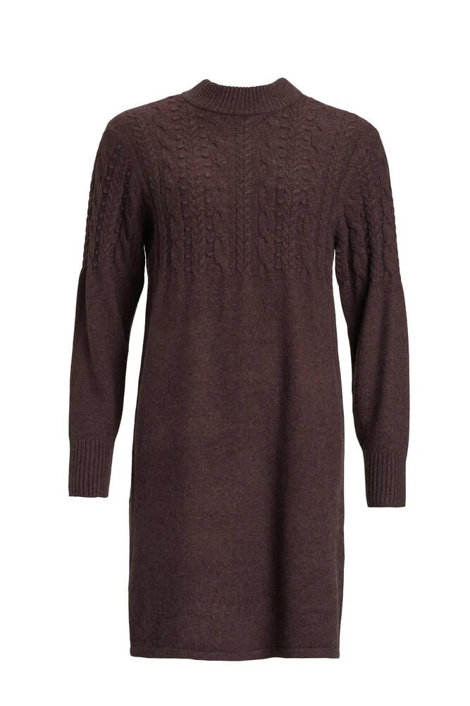Naisten miellyttävä neulemekko pitkillä hihoilla. Yläosa on koristeltu tyylikkäällä kuvioneuloksella.
