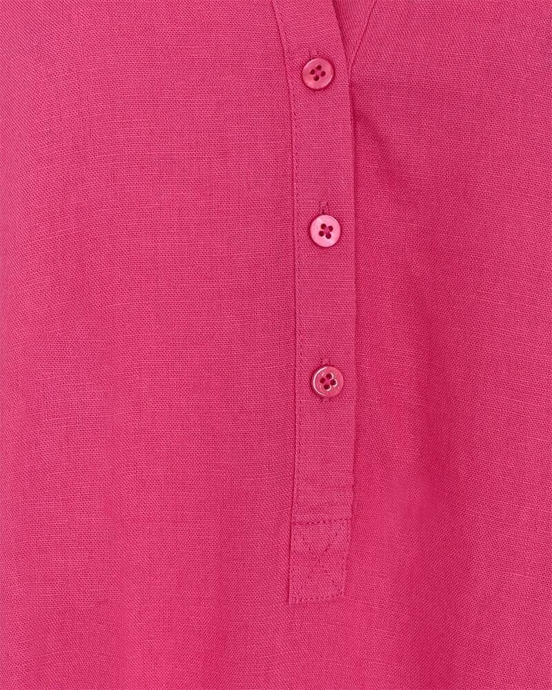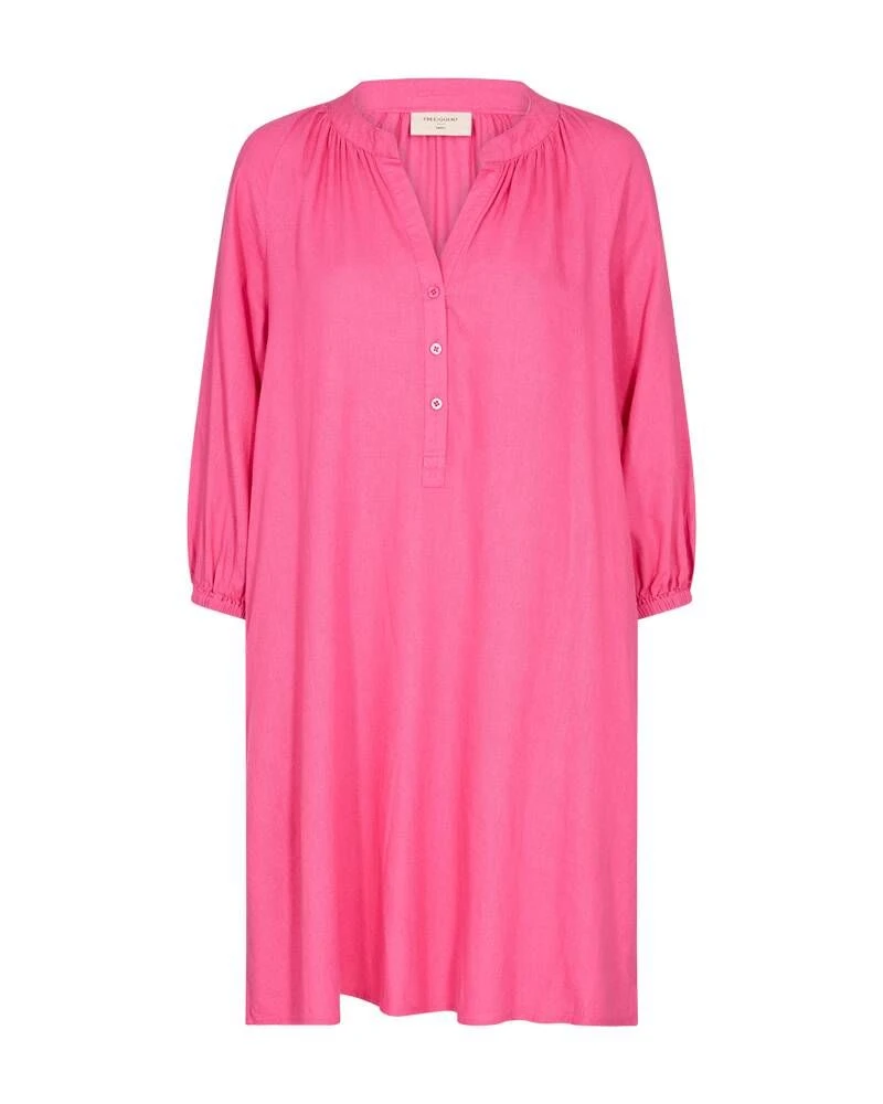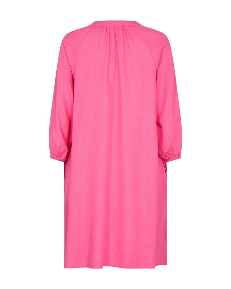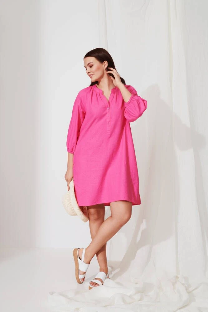 Naisten väljä pellavasekoitteinen mekko vajaamittaisilla 3/4-hihoilla ja pääntien poimutuksilla. V-pääntieltä lähtee lyhyt nappilista.