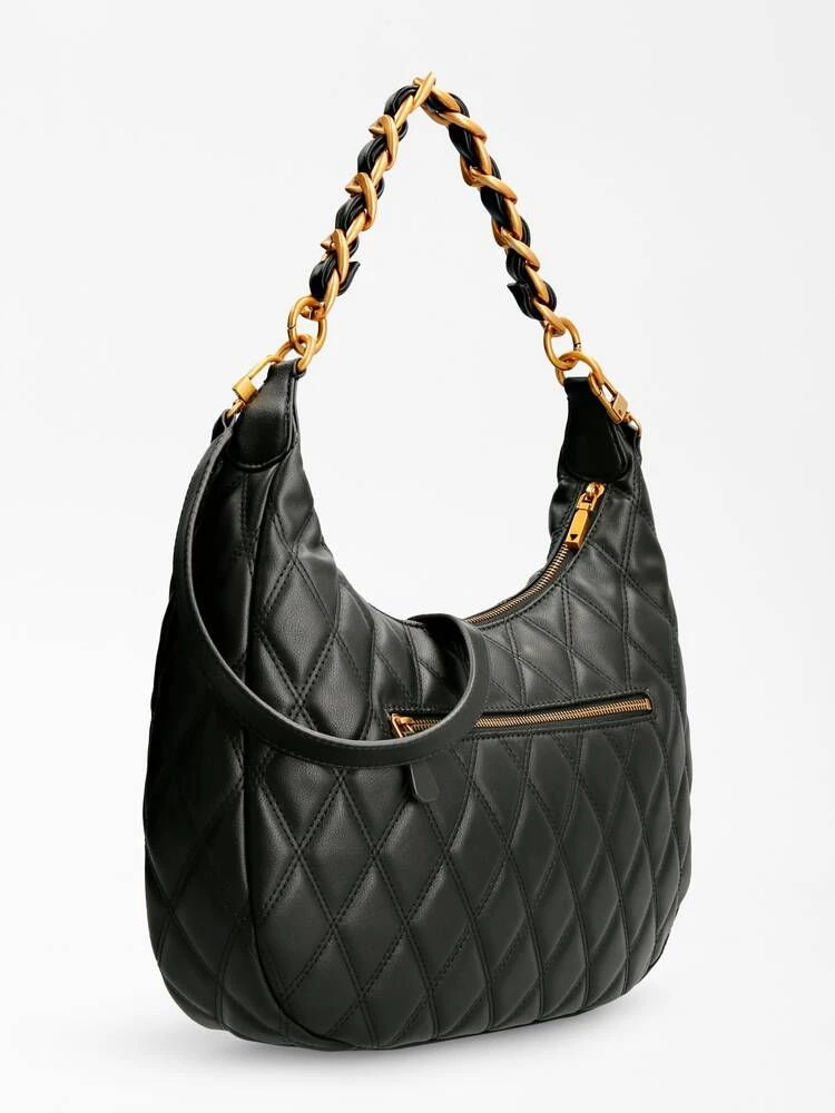 Tyylikäs Guess -laukku tikatullapinnalla. Laukussa on lyhyempi ketjuhihna ja pidempi säädettävä olkahihna.