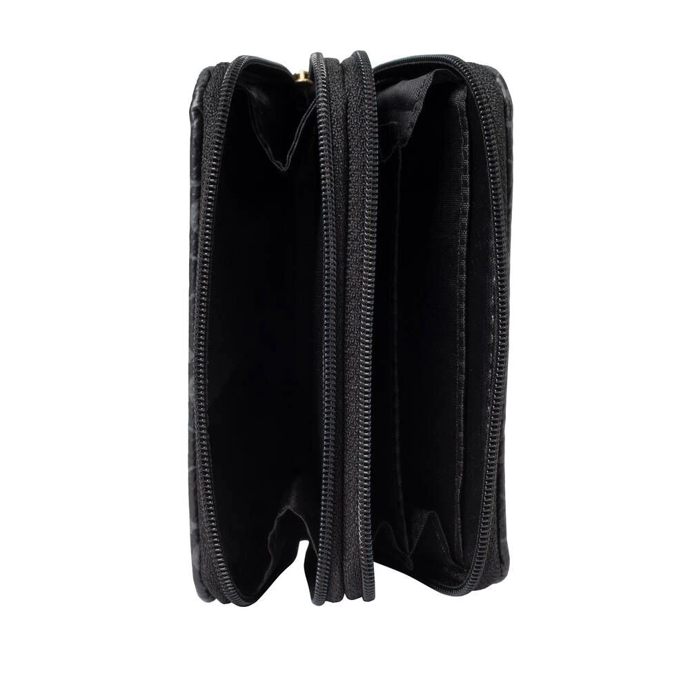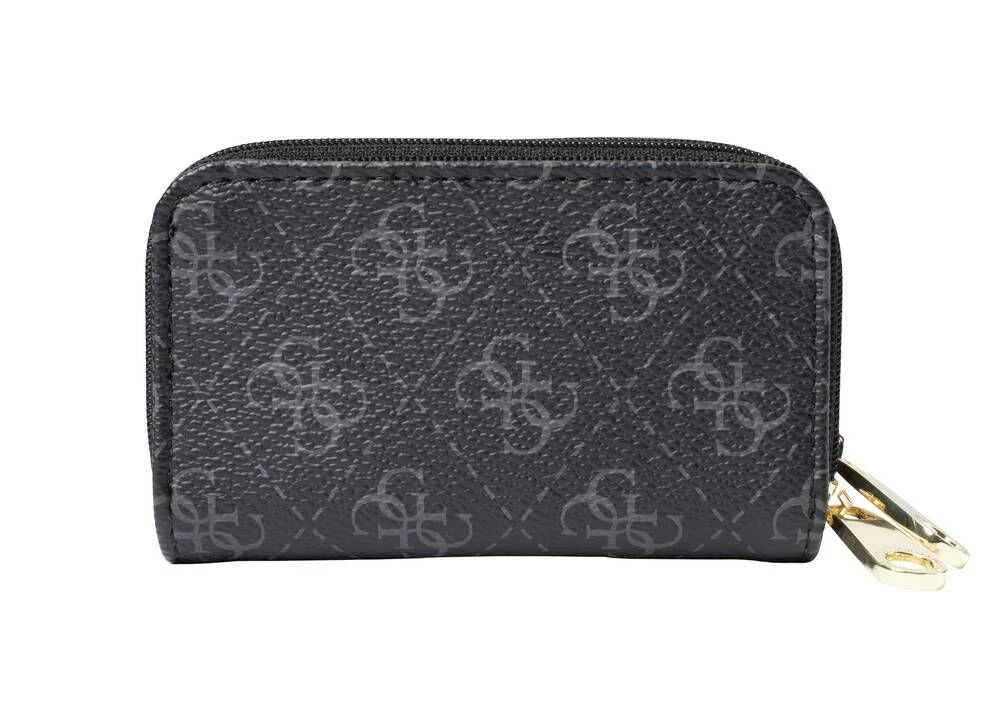Guessin pieni lompakko logokuvioidulla pinnalla. Lompakossa on kaksi erillista vetoketjutaskua.