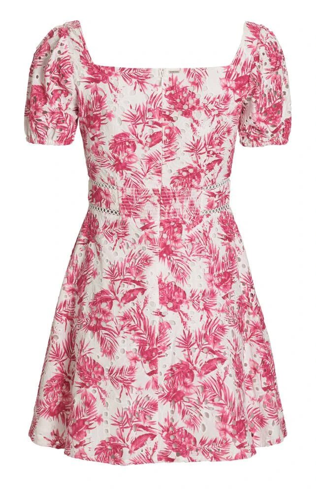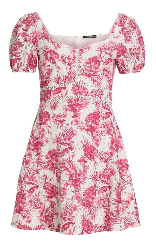 Lyhyt puuvillamekko raikkaan pinkillä lehtikuosilla ja lyhyillä hihoilla. Selkäpuolella on pukemista helpottava piilovetoketju.