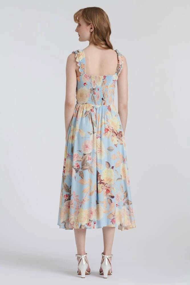 Naisten maanläheinen kukkamekko rypytetyillä olkaimilla ja levenevällä helmalla.