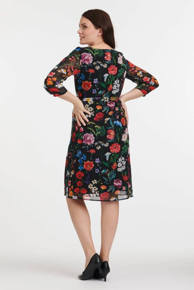 Naisten juhlava mekko kukkakuosilla. Mekossa on vajaamittaiset hihat ja vyötärölle solmittava vyö.