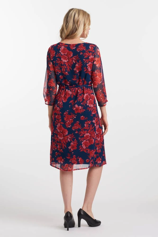 Naisten kevyt sifonkimekko pyöreällä pääntiellä ja pitkillä, läpikuultavilla hihoilla. Kukkakuvioisen mekon vyötäröllä on solmittava nauhavyö.