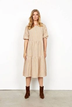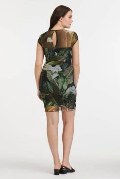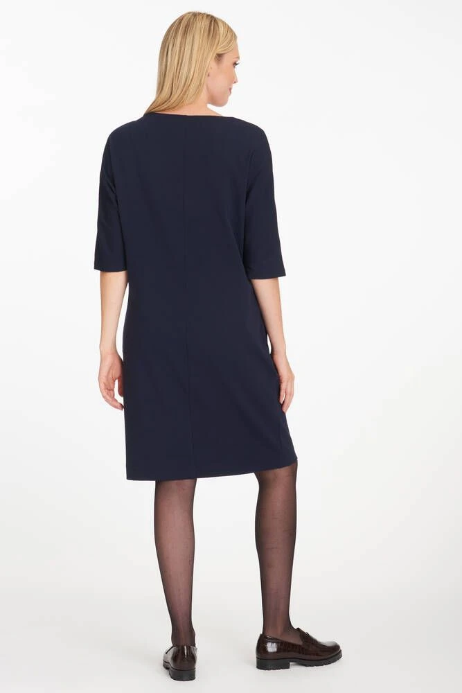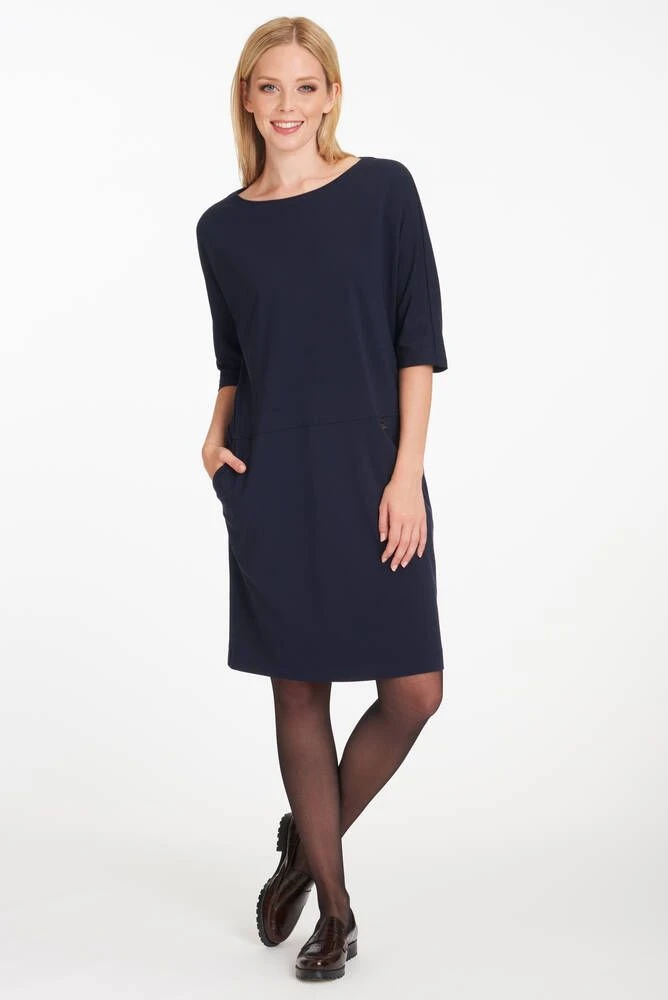 Yksivärinen trikoomekko lepakkohihoilla ja kätevillä etutaskuilla. Edessä on tyylikäs poikkisauma.