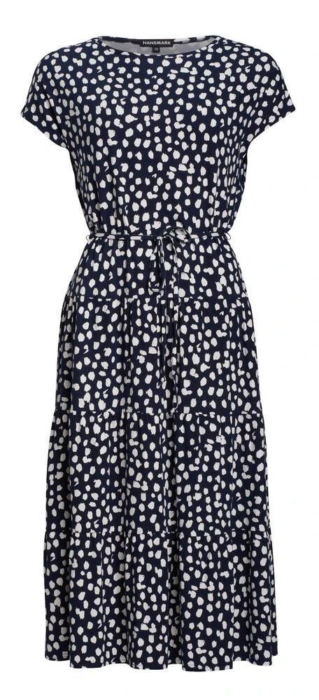 Naisten joustava trikoomekko laikkukuosilla. Mekossa on röyhelöhelma ja vyötärölle solmittava naru.