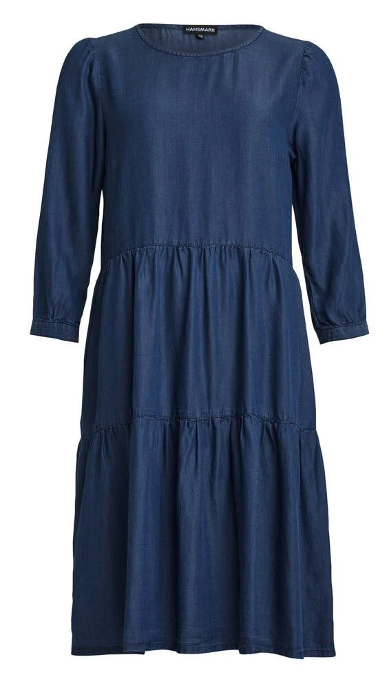 Ihanan kevyt farkkutyylinen mekko pyöreällä pääntiellä ja vajaamittaisilla hihoilla. Mekossa on kaunis frillahelma ja sivusaumoissa kätevät taskut.