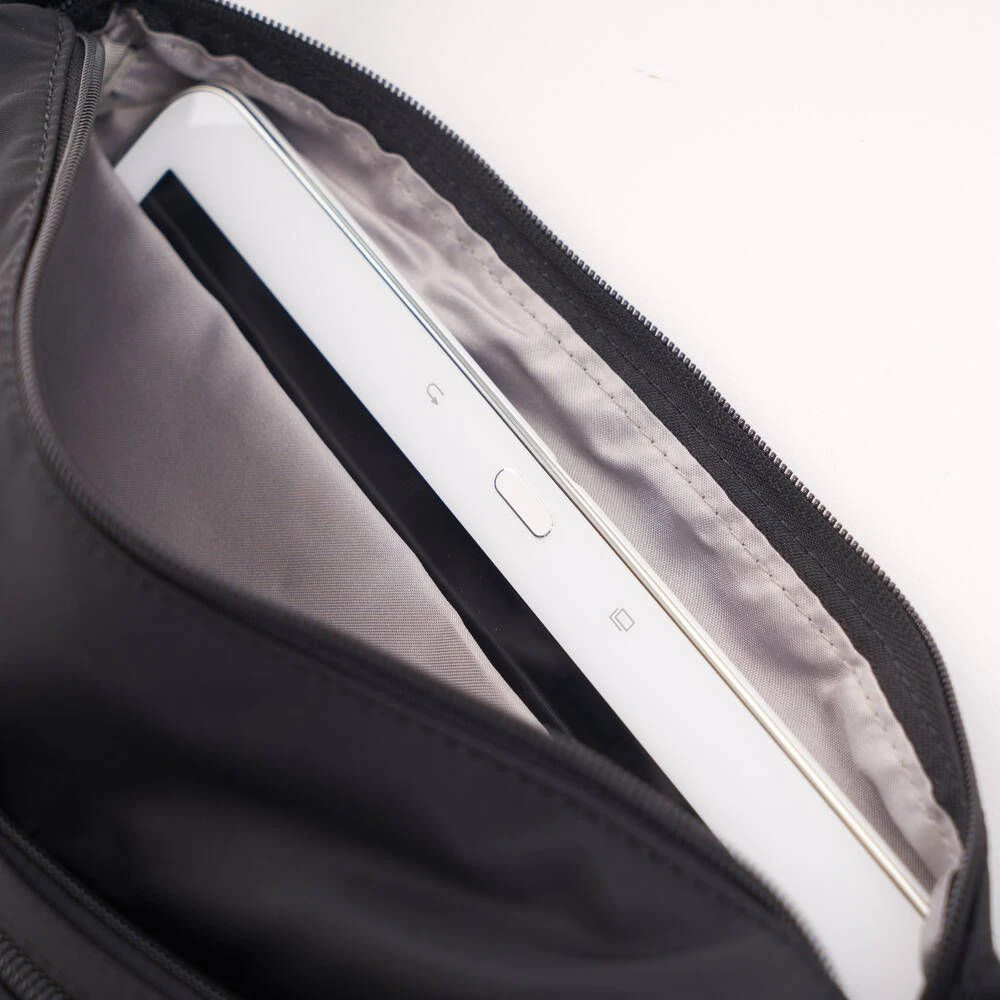 Monipuolinen ja kevyt laukku useilla taskuilla. Laukun sisällä on RFID-suojattu tasku.