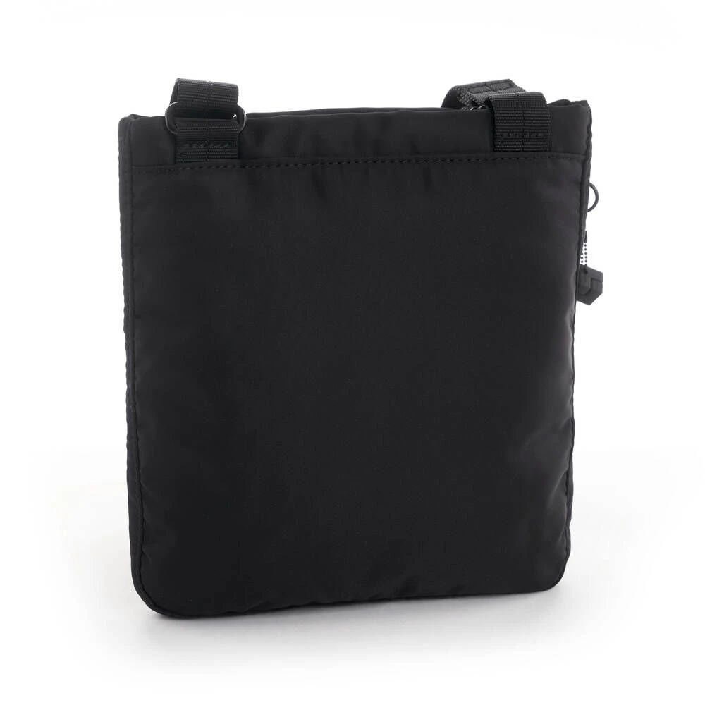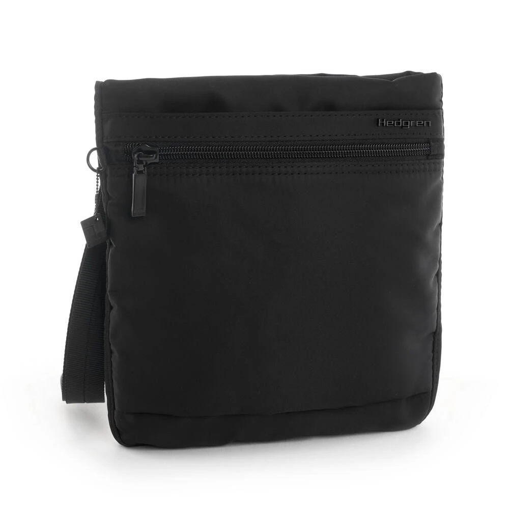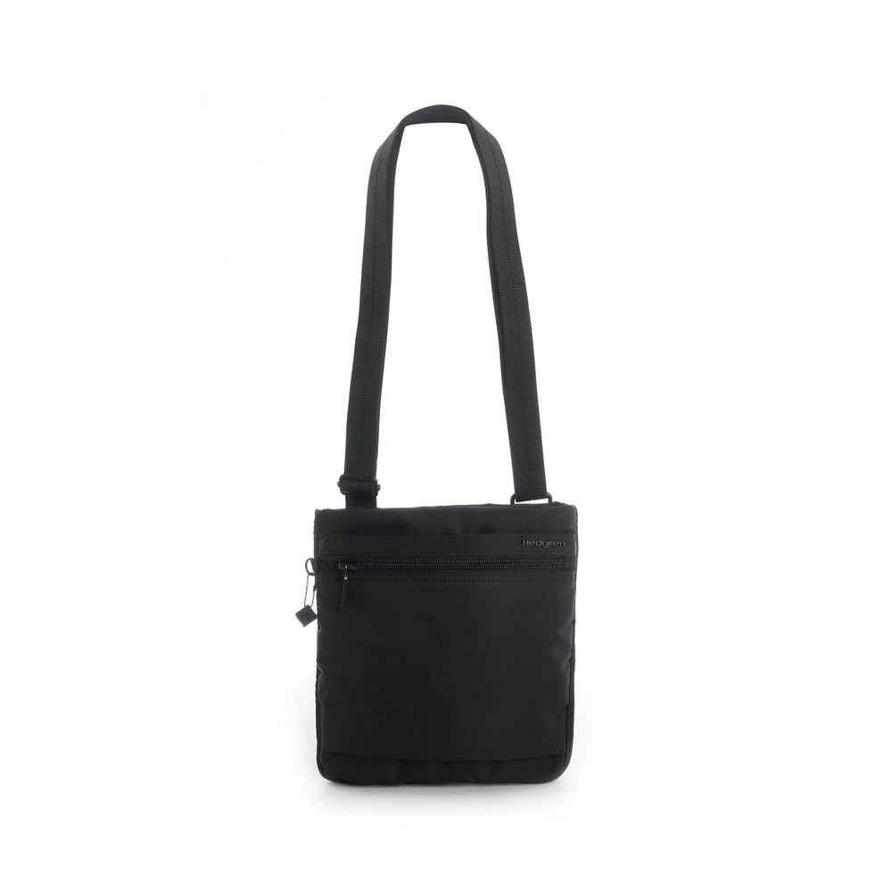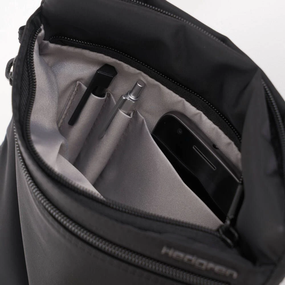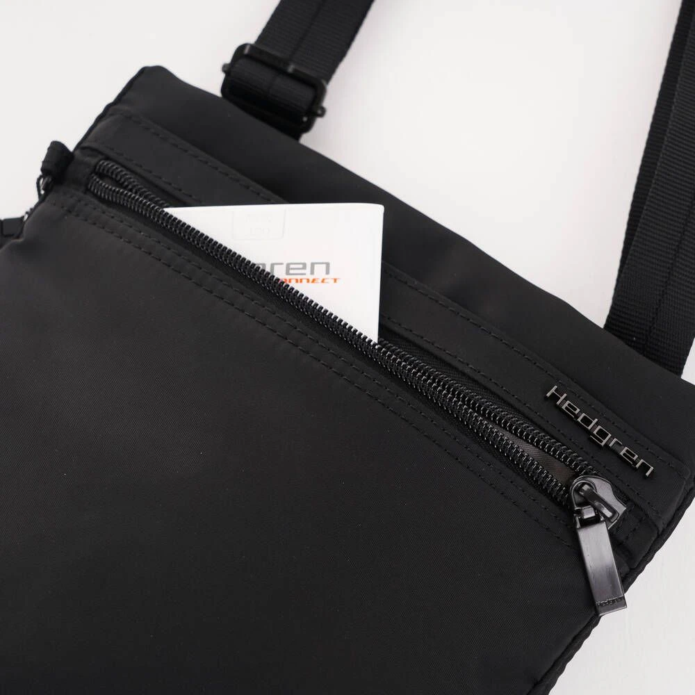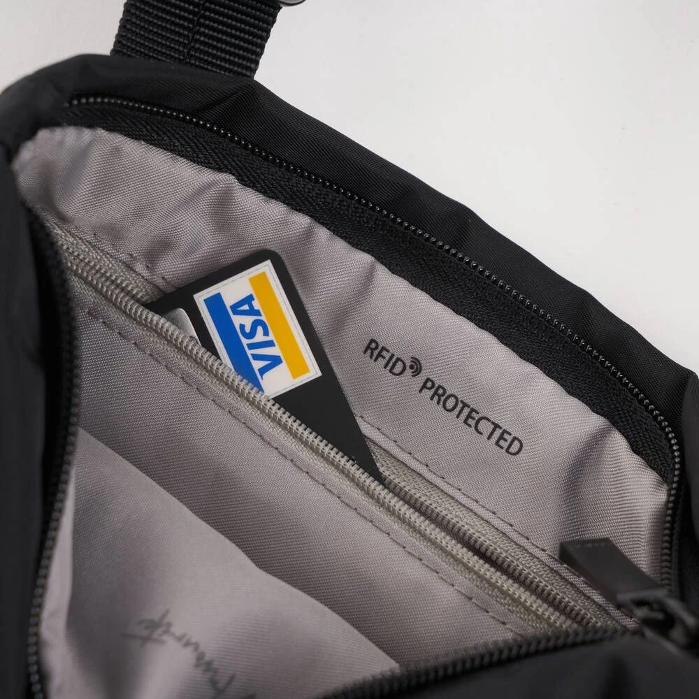 Pieni, litteä ja kevyt RFID-suojattu olkalaukku. Laukussa on vetoketjutaskut edessä ja takana.
