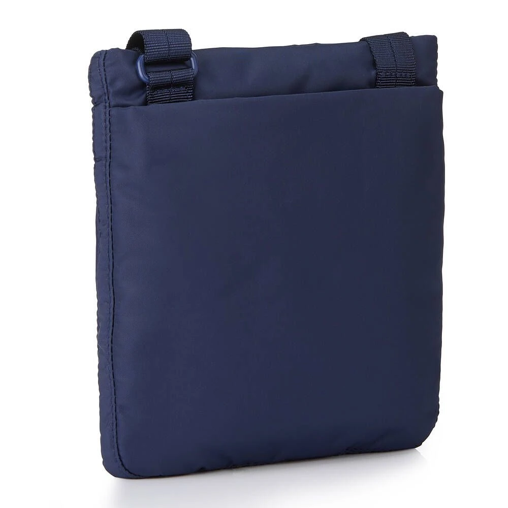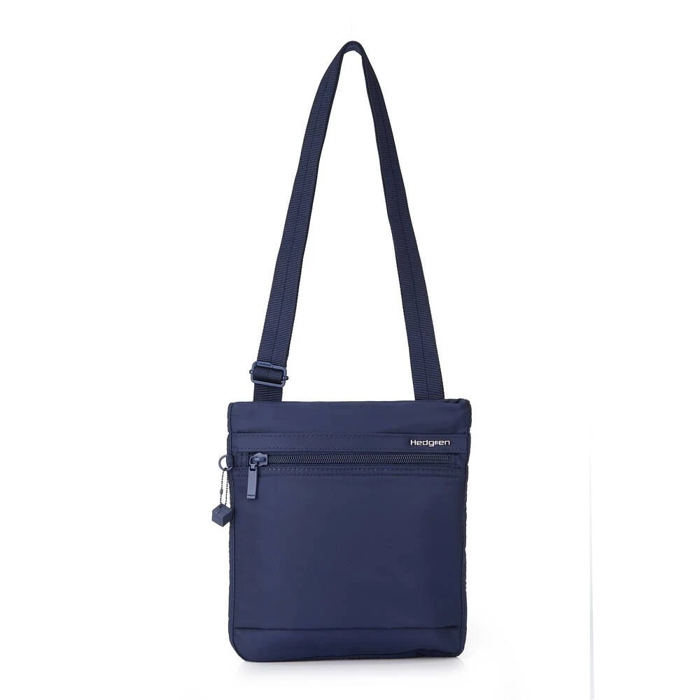 Pieni, litteä ja kevyt RFID-suojattu olkalaukku. Laukussa on vetoketjutaskut edessä ja takana.
