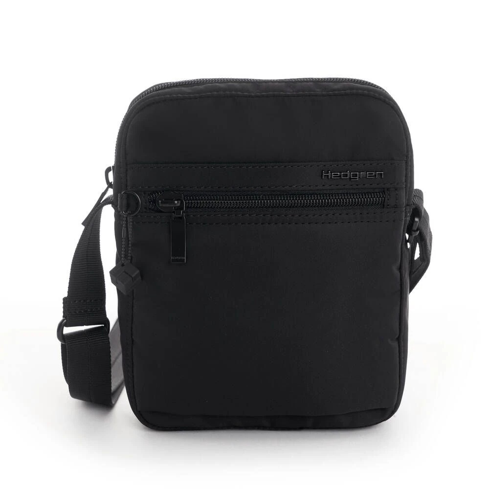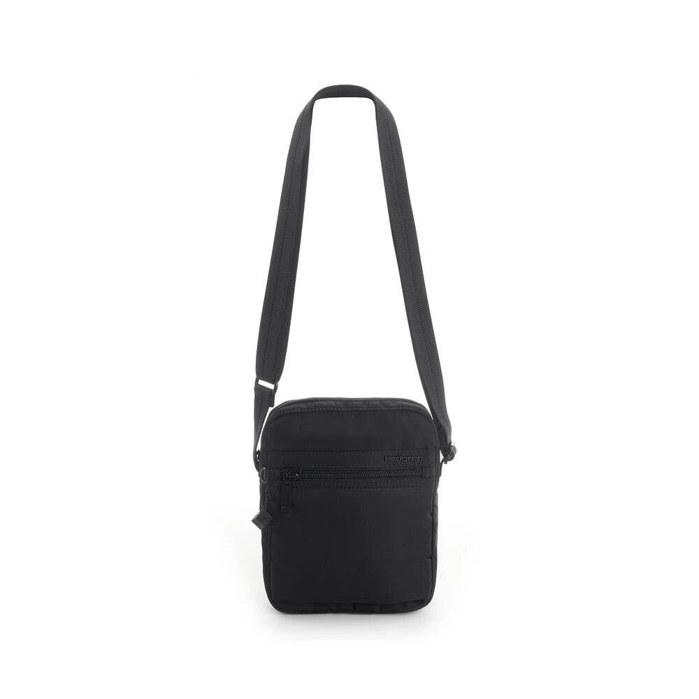 Pieni ja kevyt RFID-suojattu olkalaukku. Laukussa on vetoketjutaskut edessä ja takana.