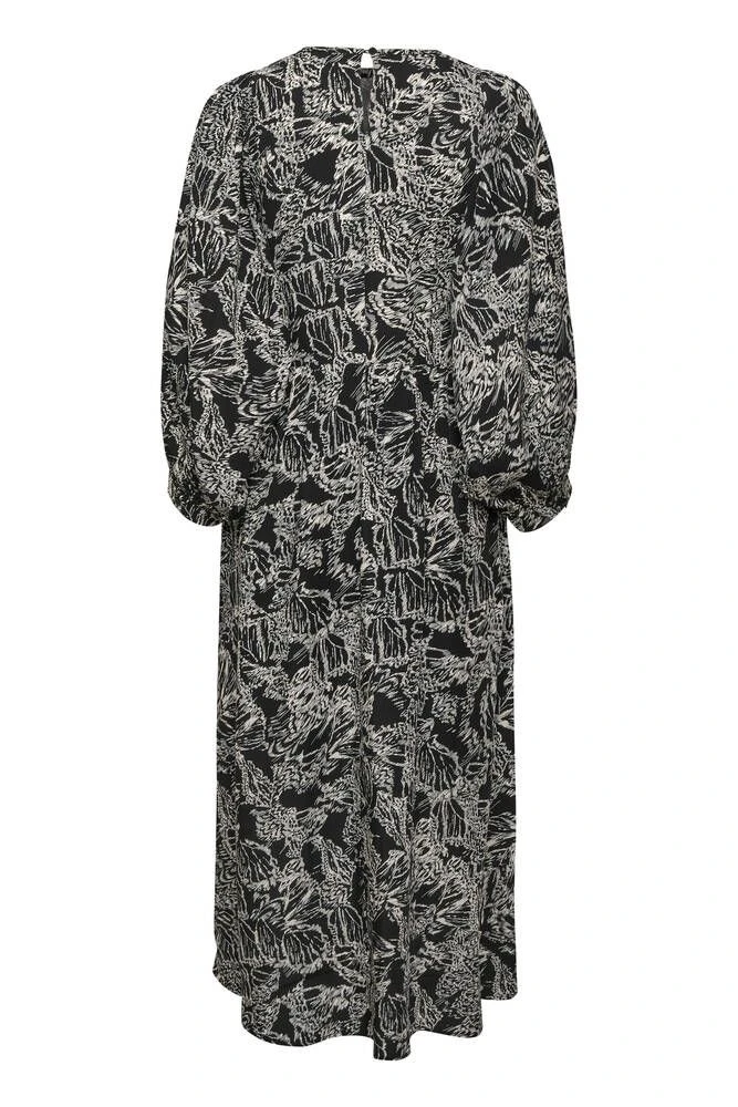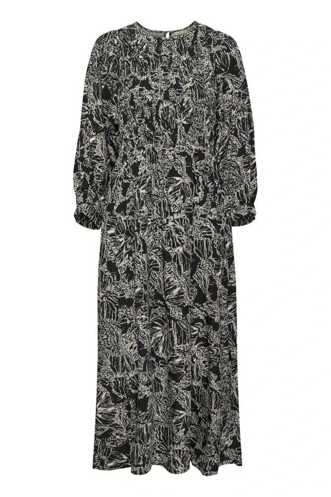 Naisten pitkä mekko mustavalkoisella kuosilla.