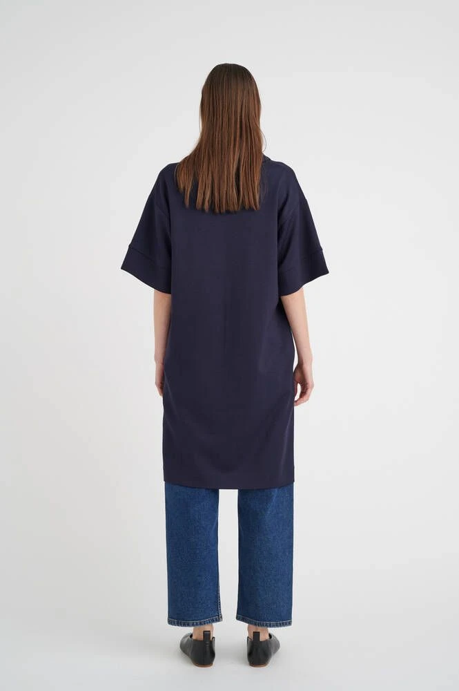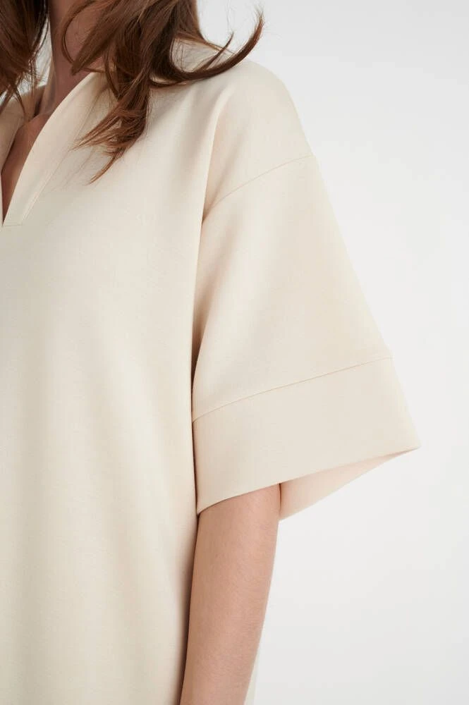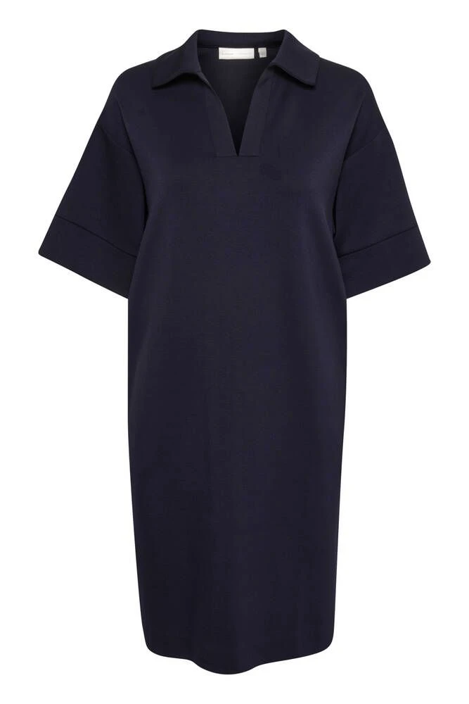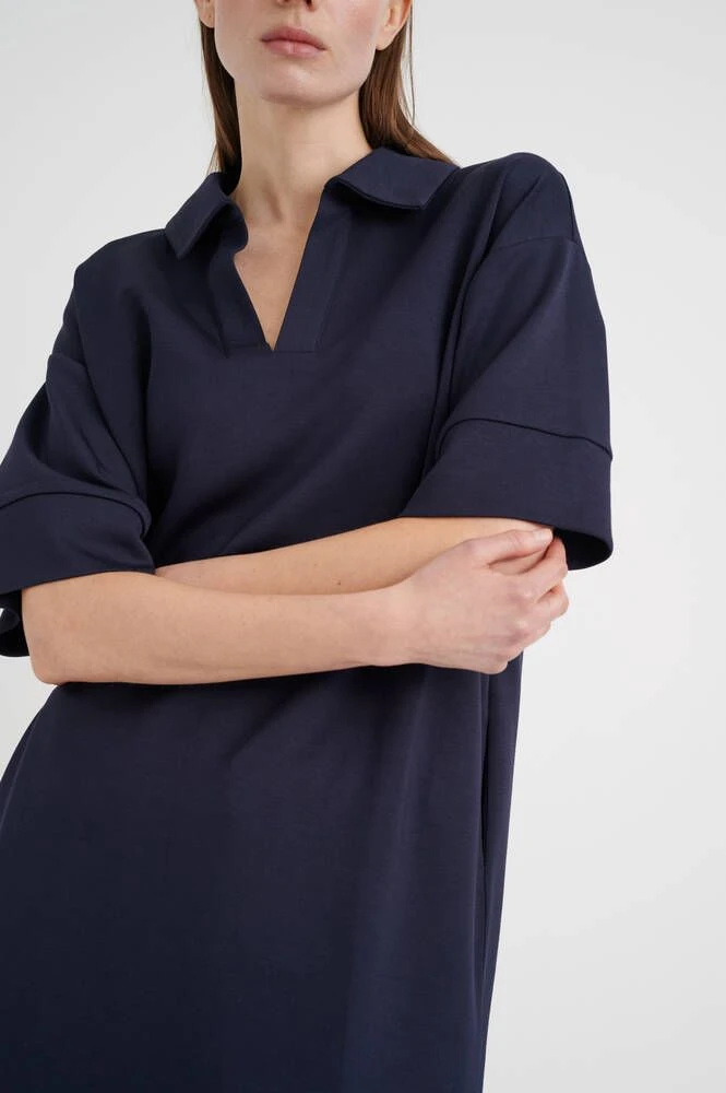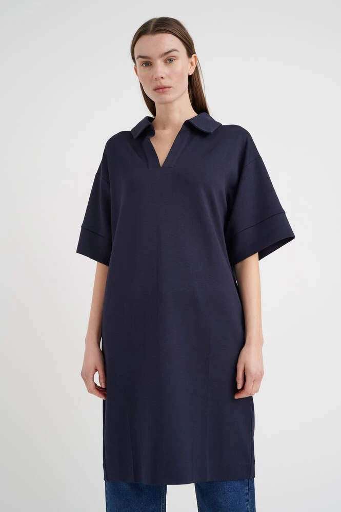 Naisten väljä ja miellyttävän joustava mekko lyhyillä hihoilla. Yksivärisen mekon V-pääntiellä on siistit kaulukset.