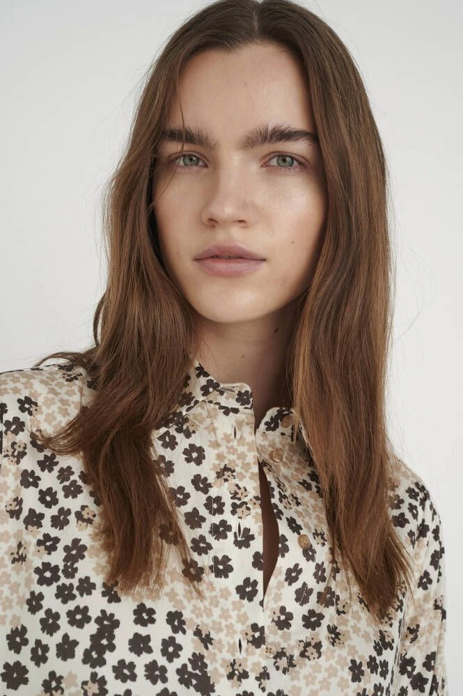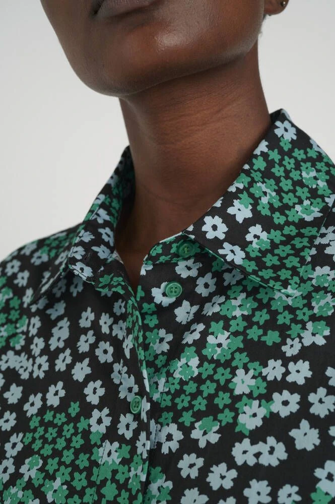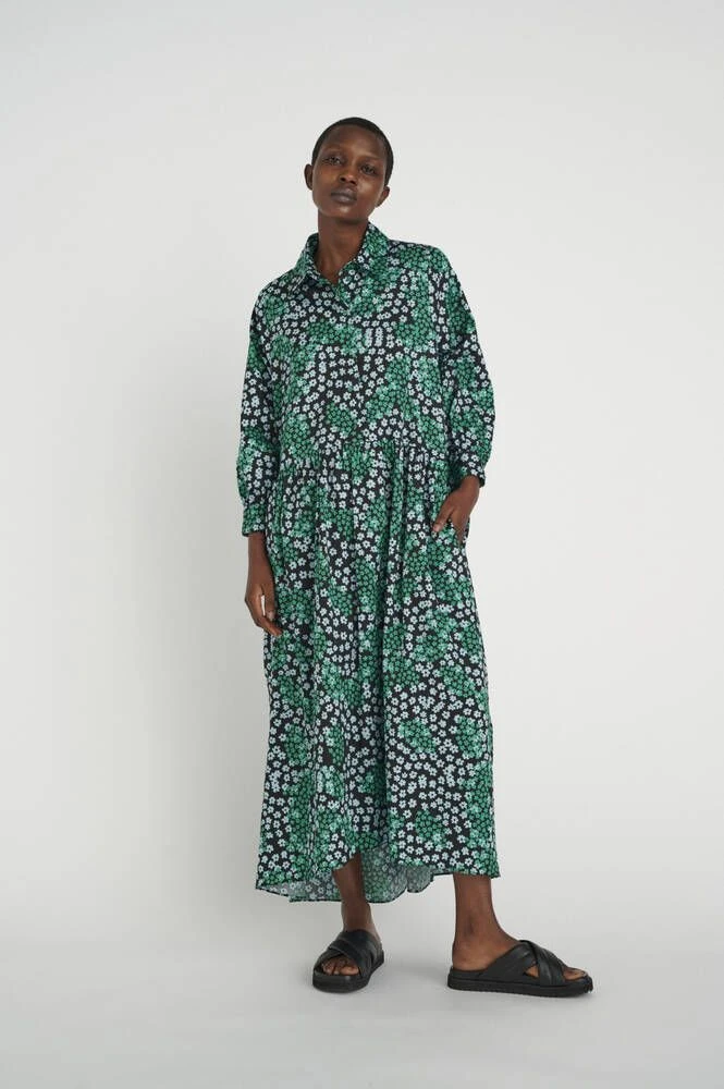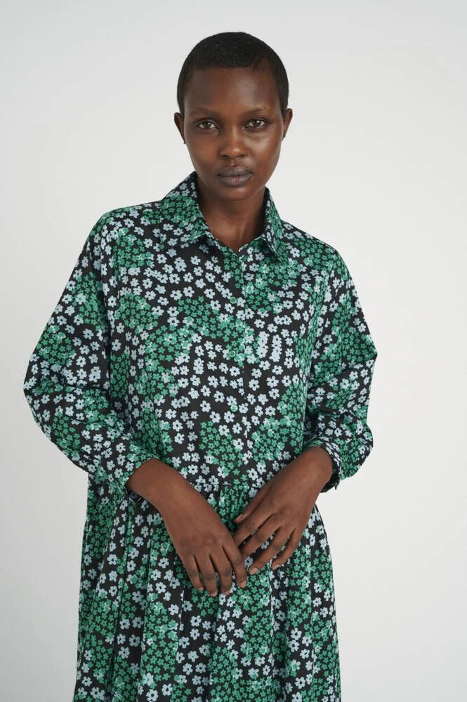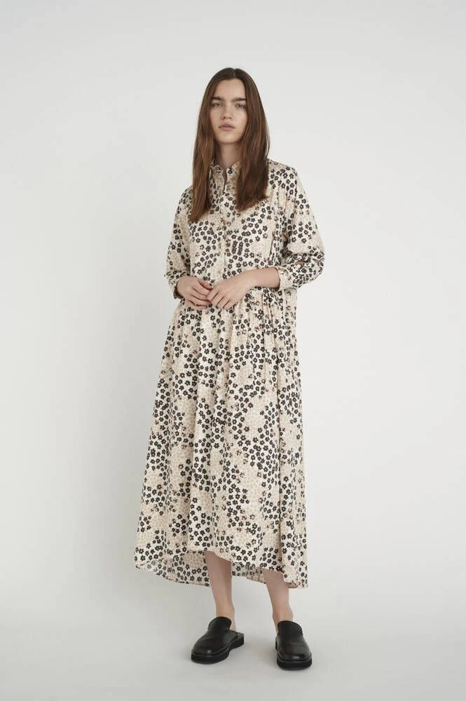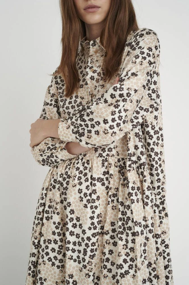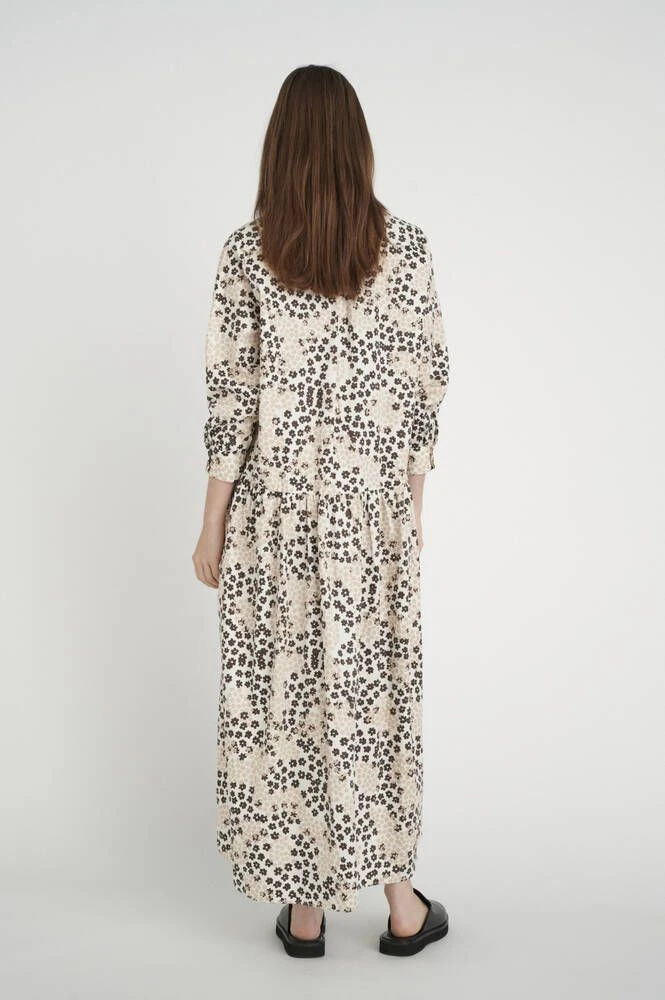 Ihana puuvillainen mekko kauniilla kukkakuosilla ja vajaamittaisilla hihoilla. Nappikaistale ulottuu pääntieltä vyötärölle.