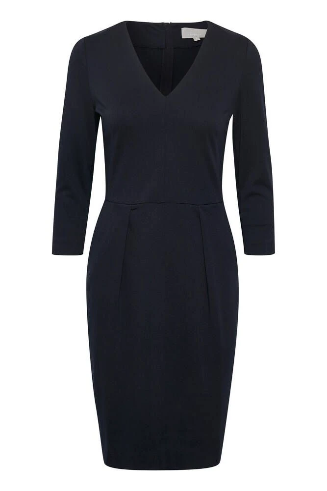 Tyköistuva kotelomekko 3/4-hihoilla ja V-pääntiellä. Vyötäröllä on huomaamattomat avotaskut ja selkäpuolella pukemista helpottava piilovetoketju.
