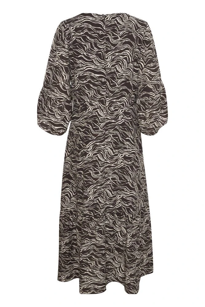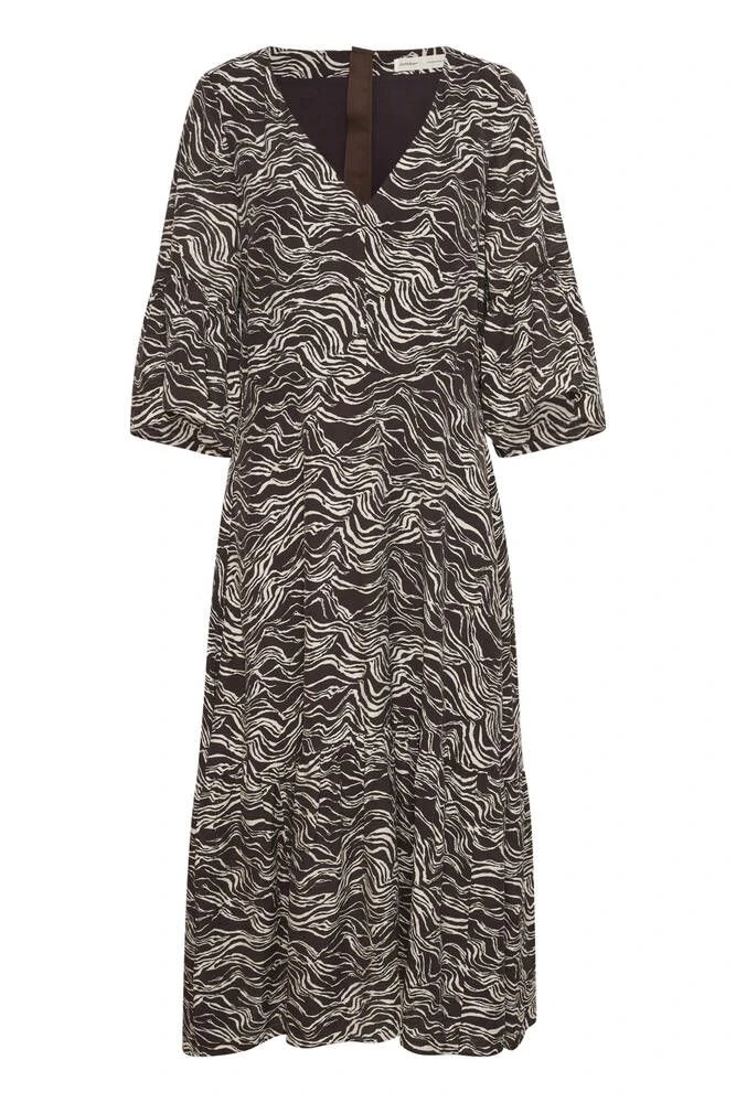 Pitkä ja väljä mekko tyylikkäällä aaltokuosilla. Kauniisti laskeutuvassa mekossa on V-pääntie sekä vajaamittaiset hihat.