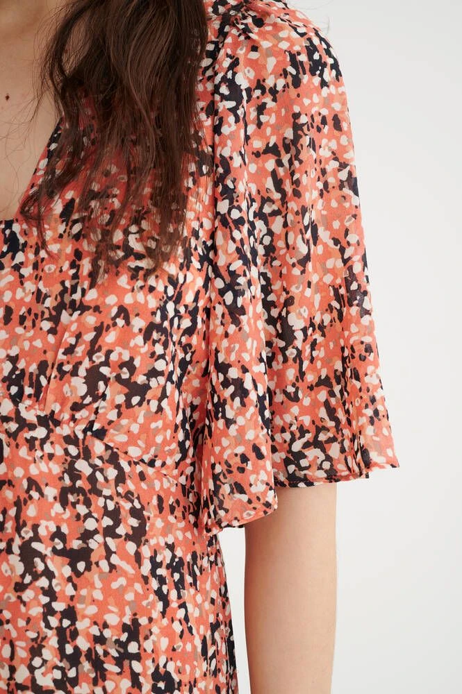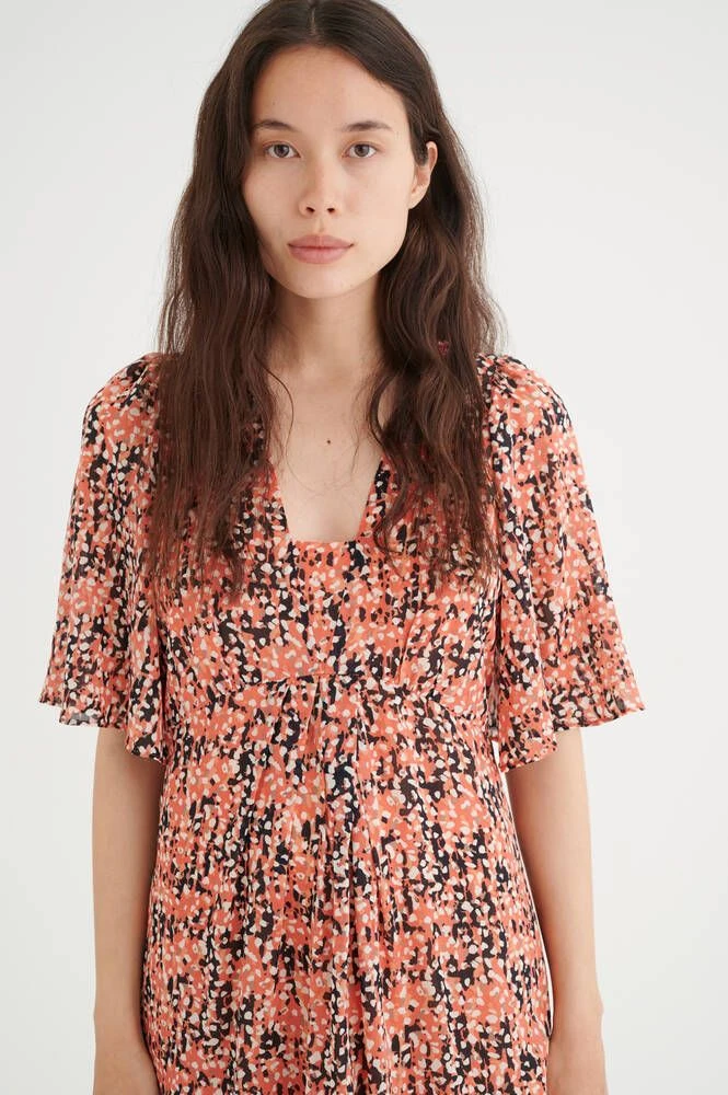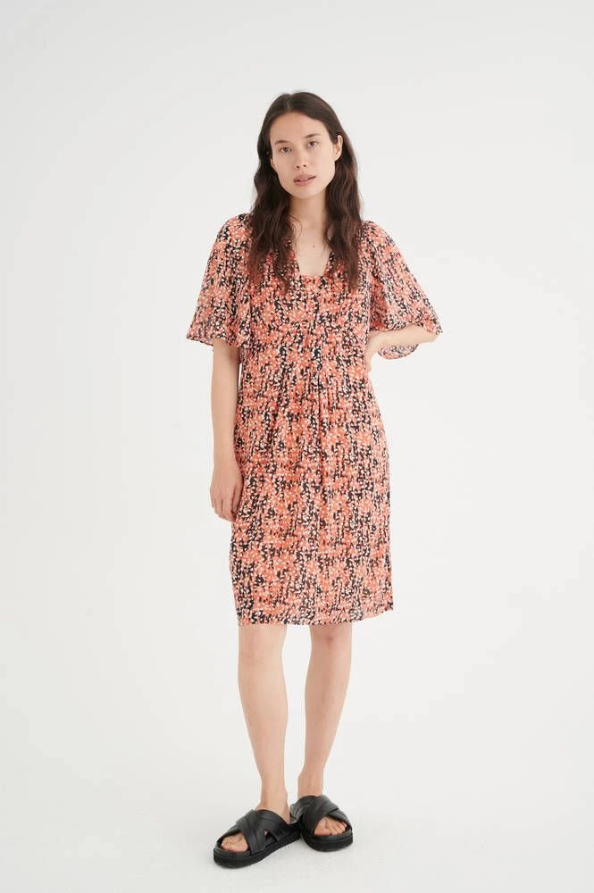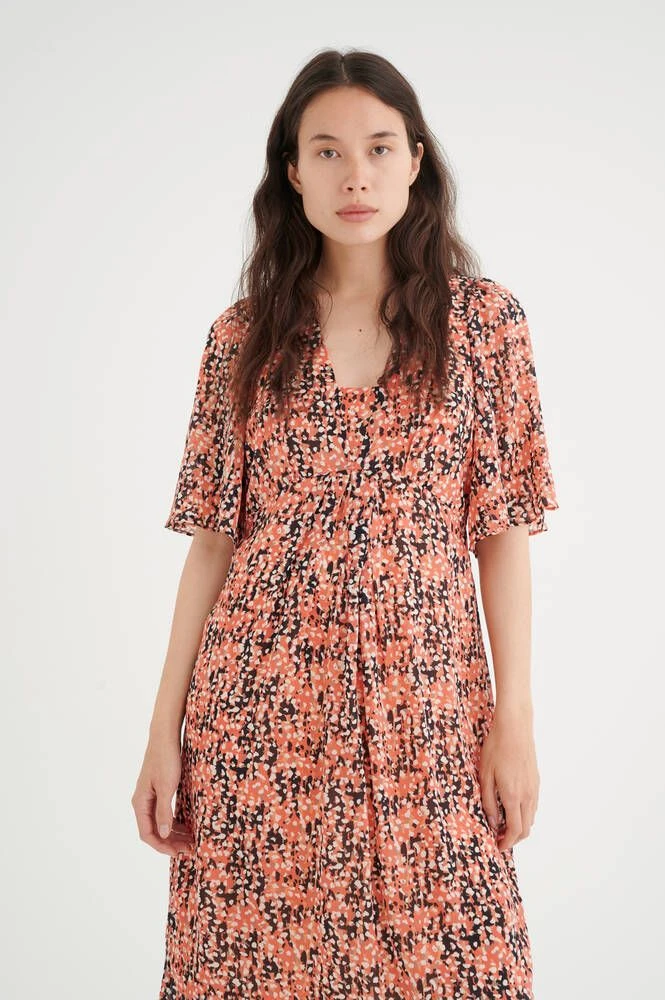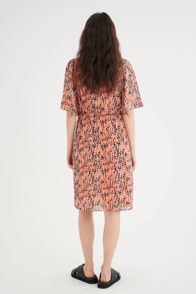 Naisten polvimittainen viskoosimekko leveähköillä, lyhyillä hihoilla ja joustavalla vyötäröllä.