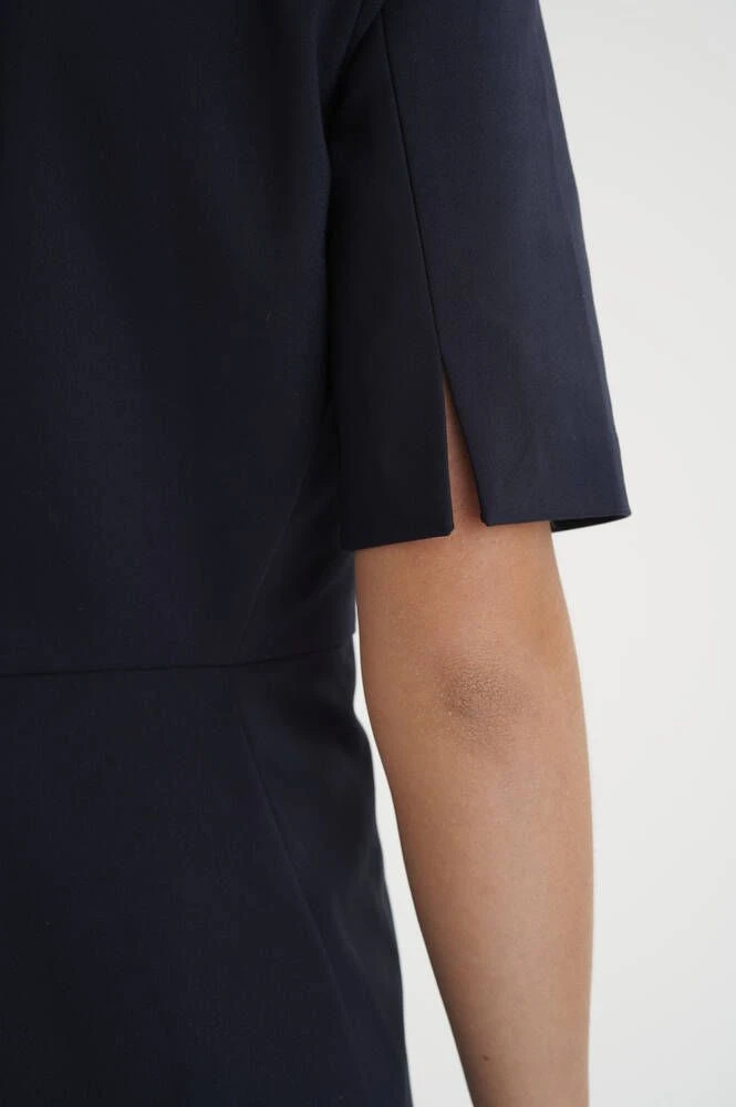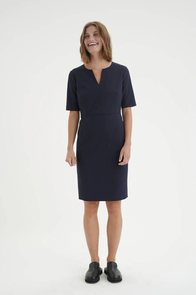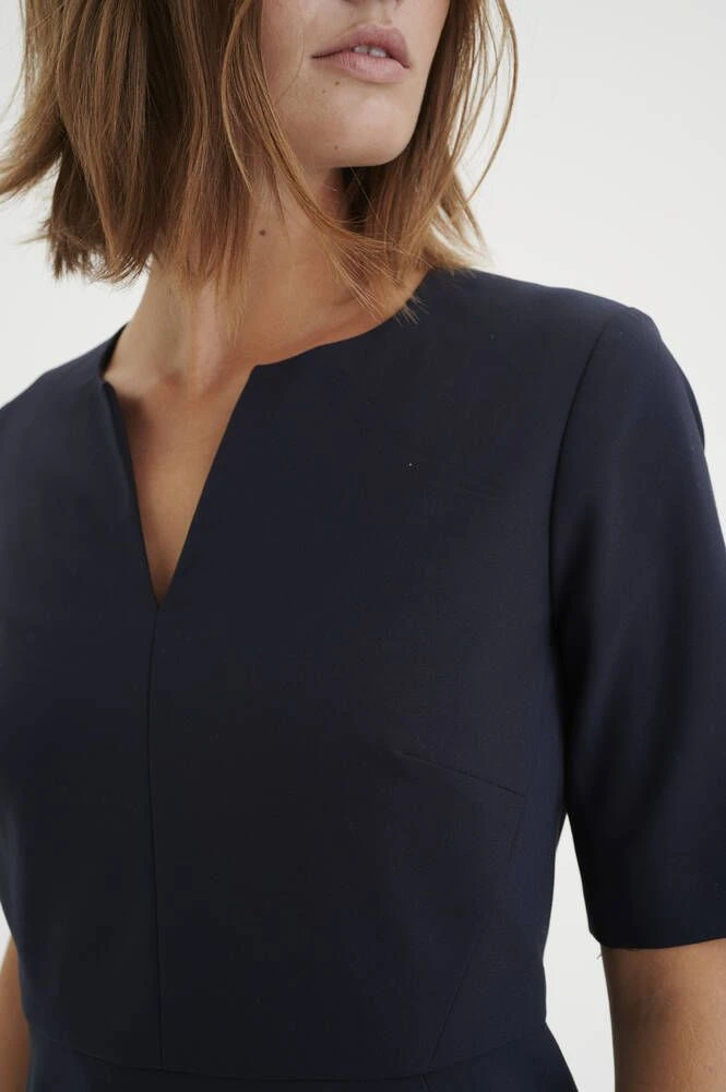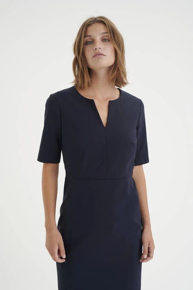 Naisten lyhythihainen kotelomekko V-pääntiellä.