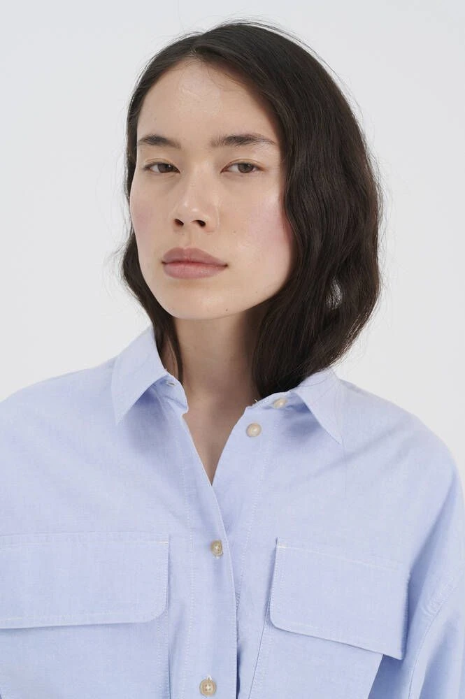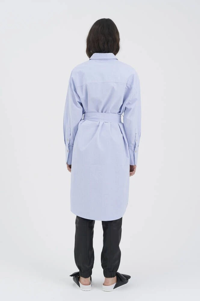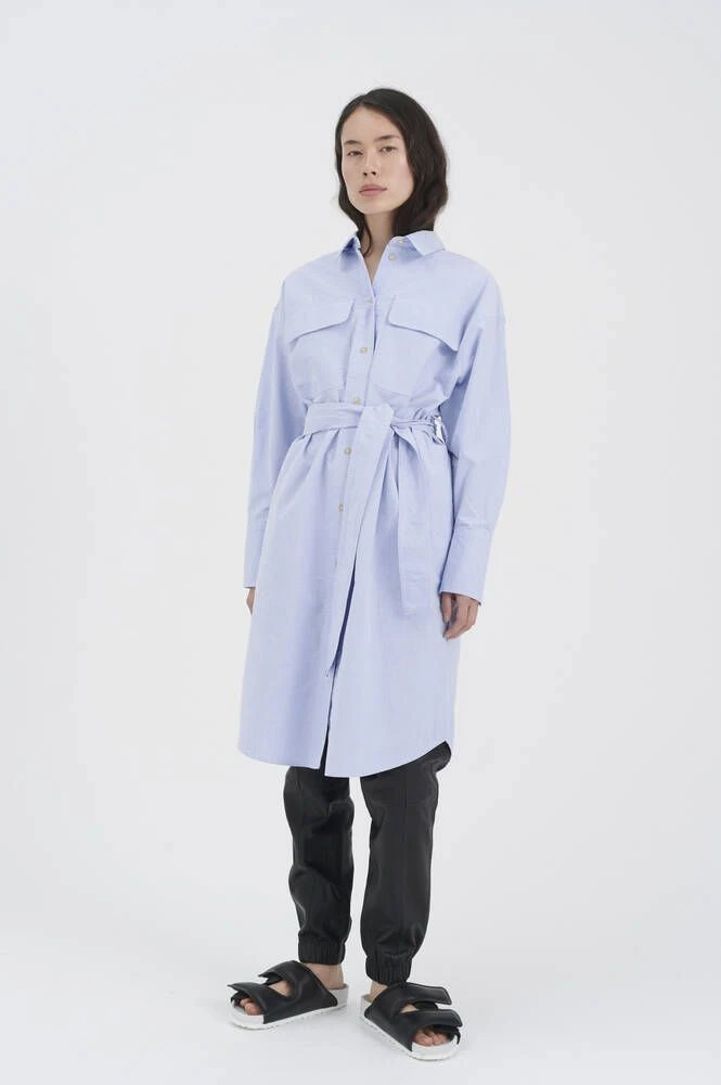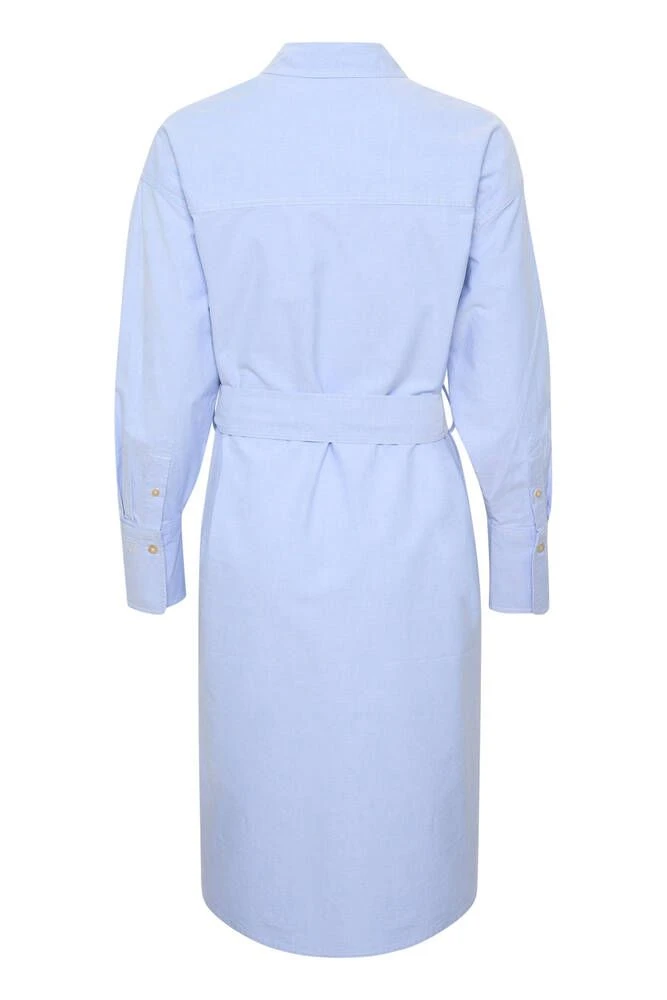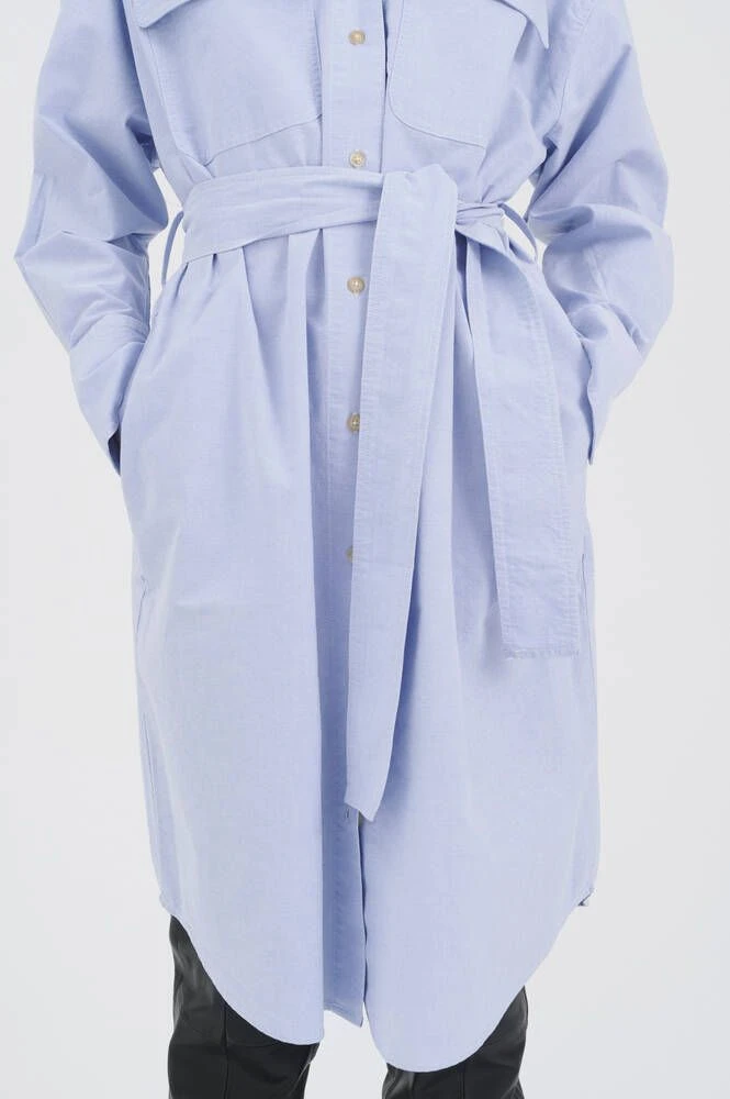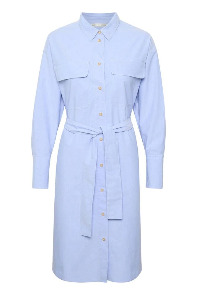 Ihana vaaleansininen paitamekko kauluksilla ja nappikiinnityksillä. Pitkähihaisessa mekossa on läpälliset rintataskut sekä vyötäröllä muotoa antava solmittava vyö.