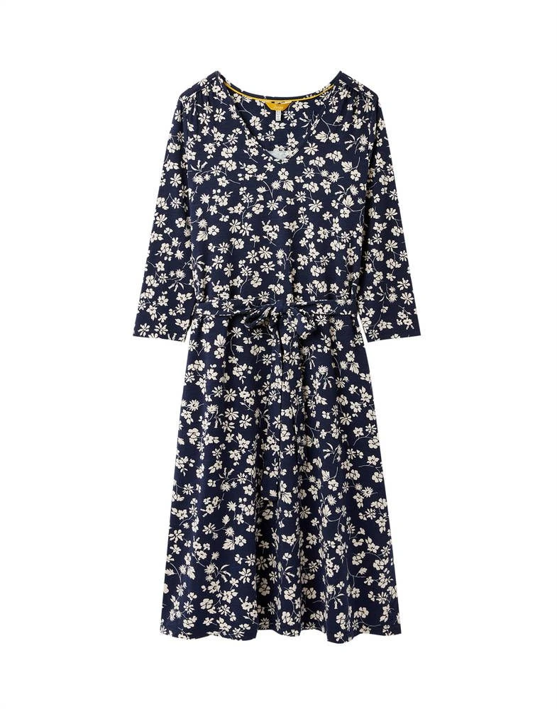 Paksuhkosta trikoosta valmistettu kukkamekko V-pääntiellä. Vyötäröllä on solmittava nauhavyö.