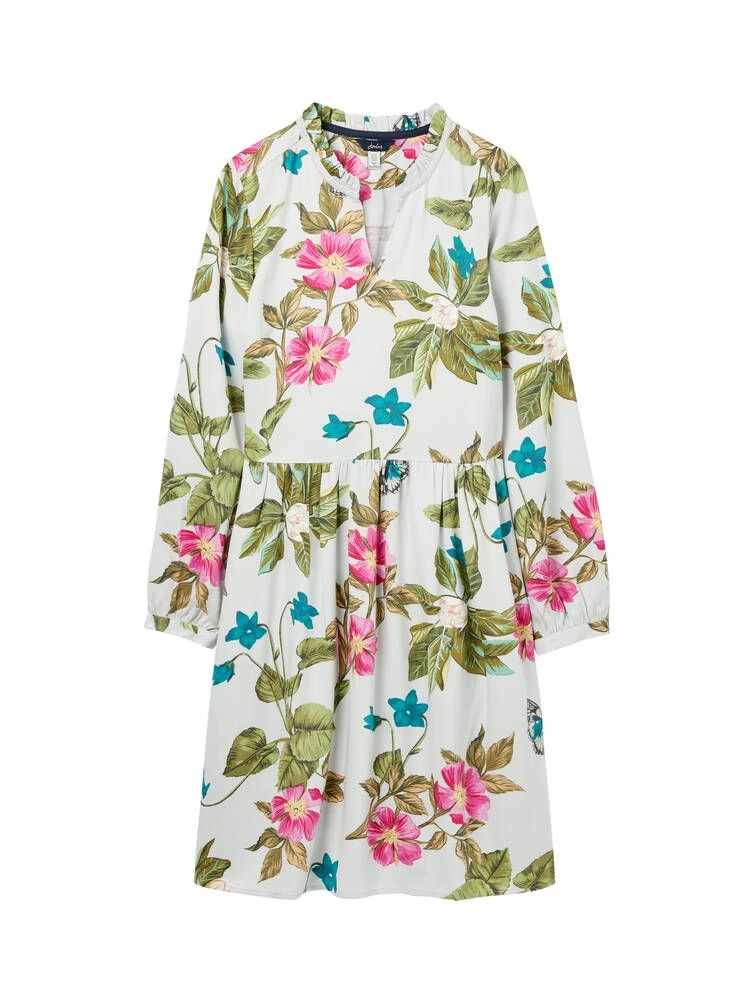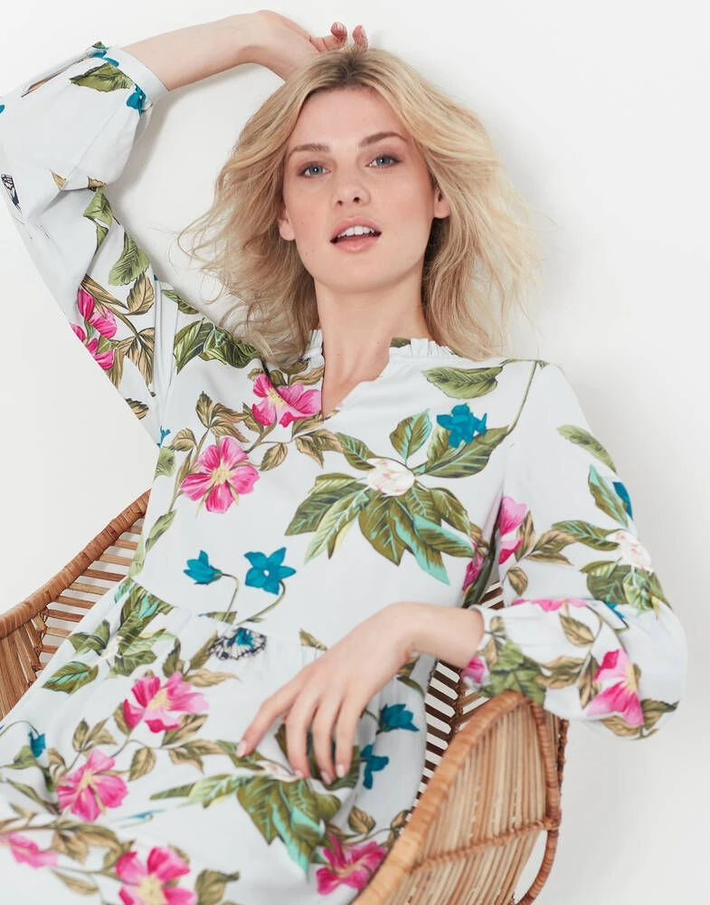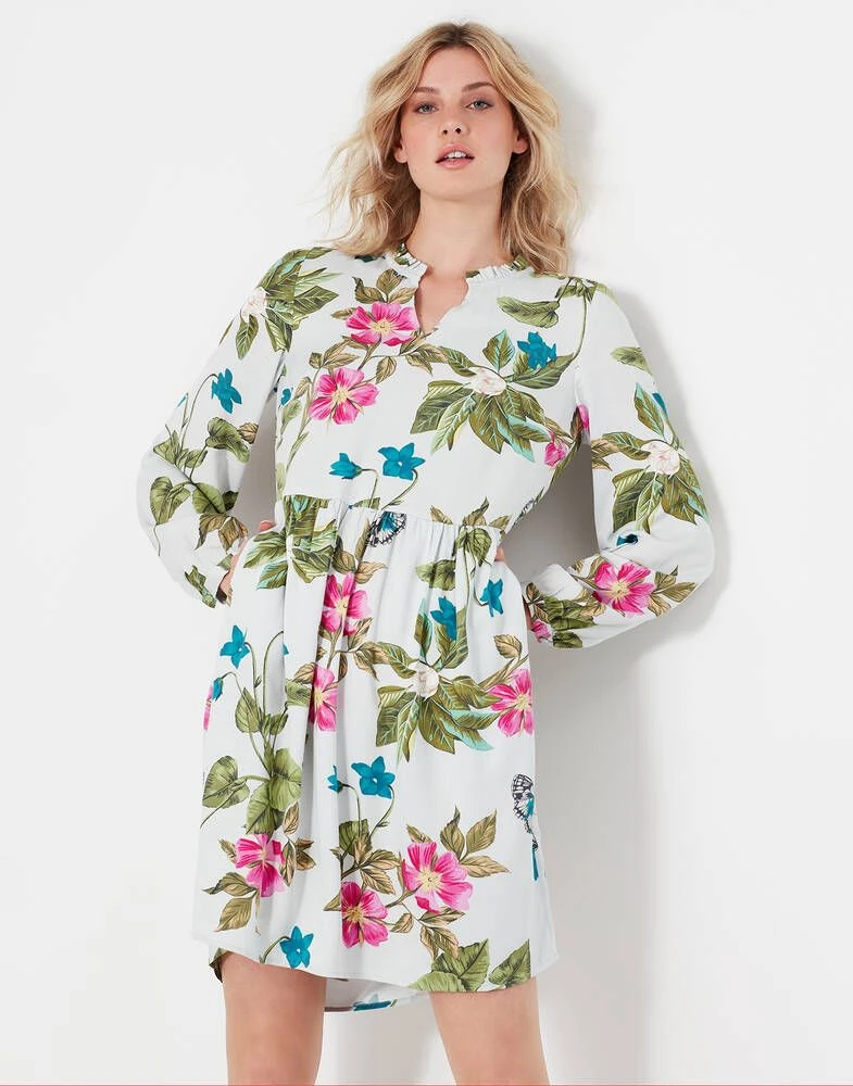 Naisten kevyt viskoosimekko pitkillä hihoilla ja raikkaalla kukkakuosilla.