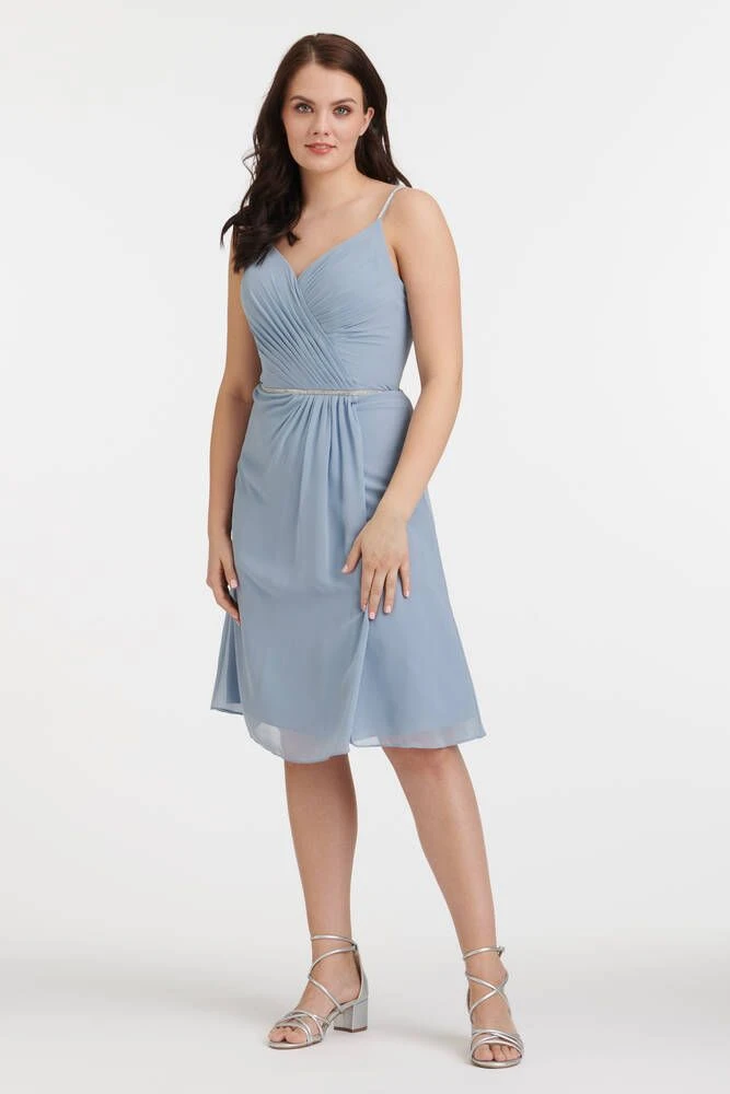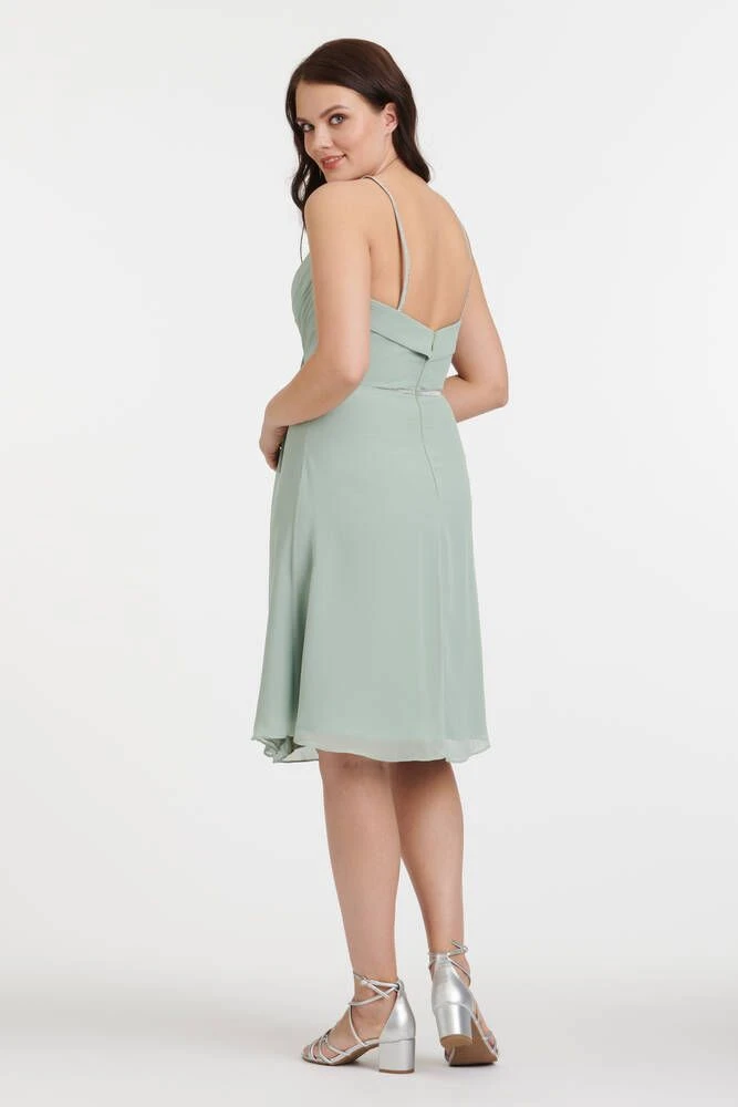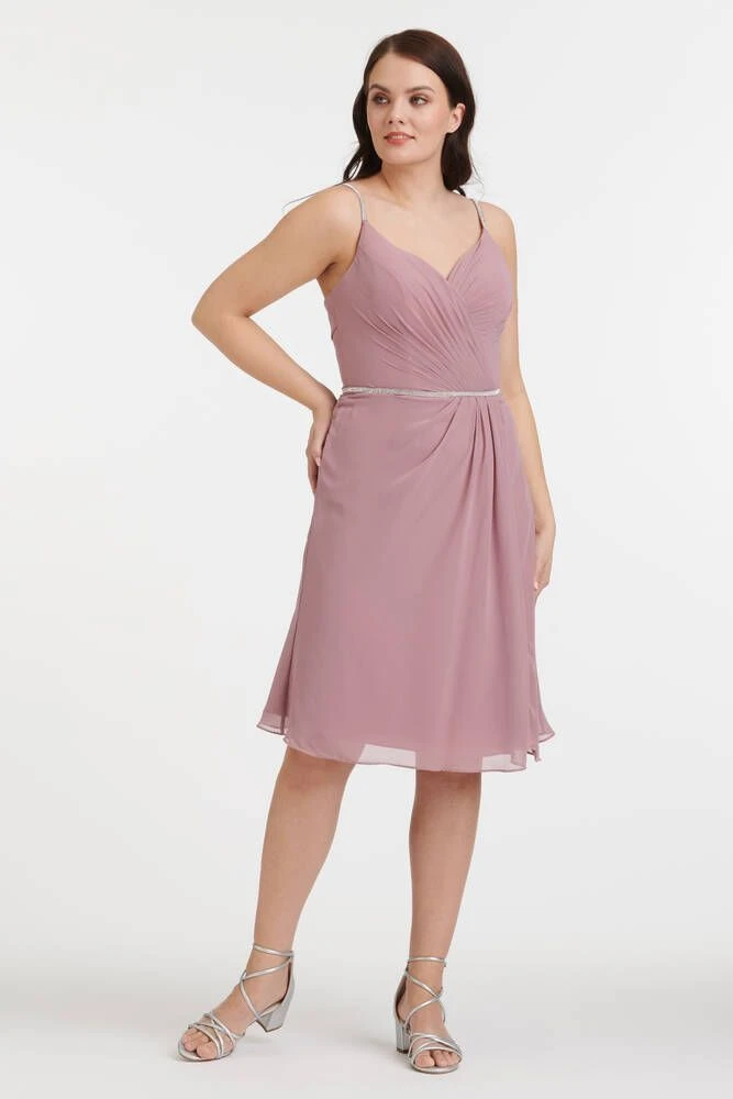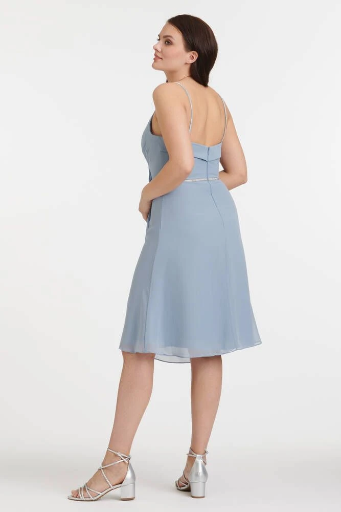 Naisten lyhyt sifonkimekko kietaisumallisella yläosalla. Mekossa on kapeat timanttiolkaimet ja vyötäröllä timanttipanta.
