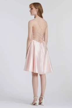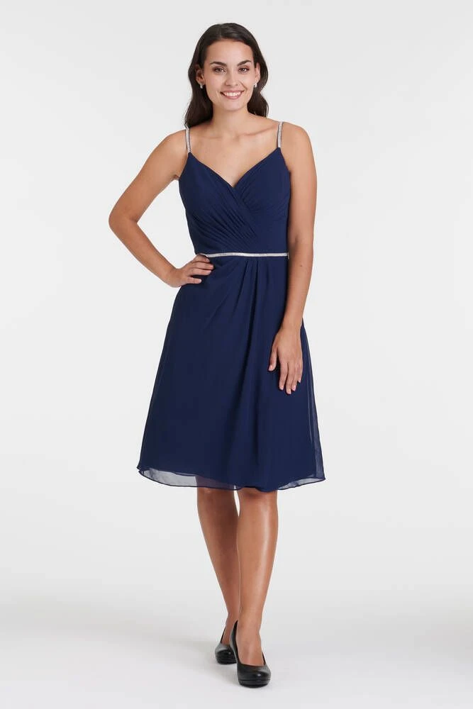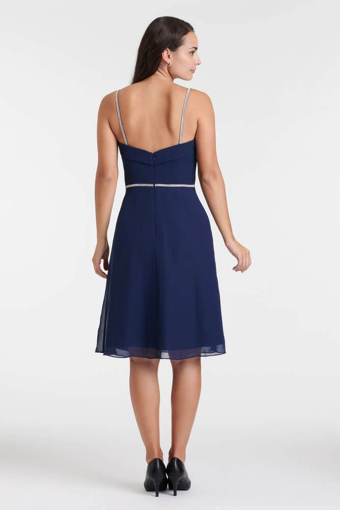 Naisten kietaisumallinen lyhyt sifonkijuhlamekko. Mekossa on kapeat timanttiolkaimet ja vyötäröllä timanttipanta.