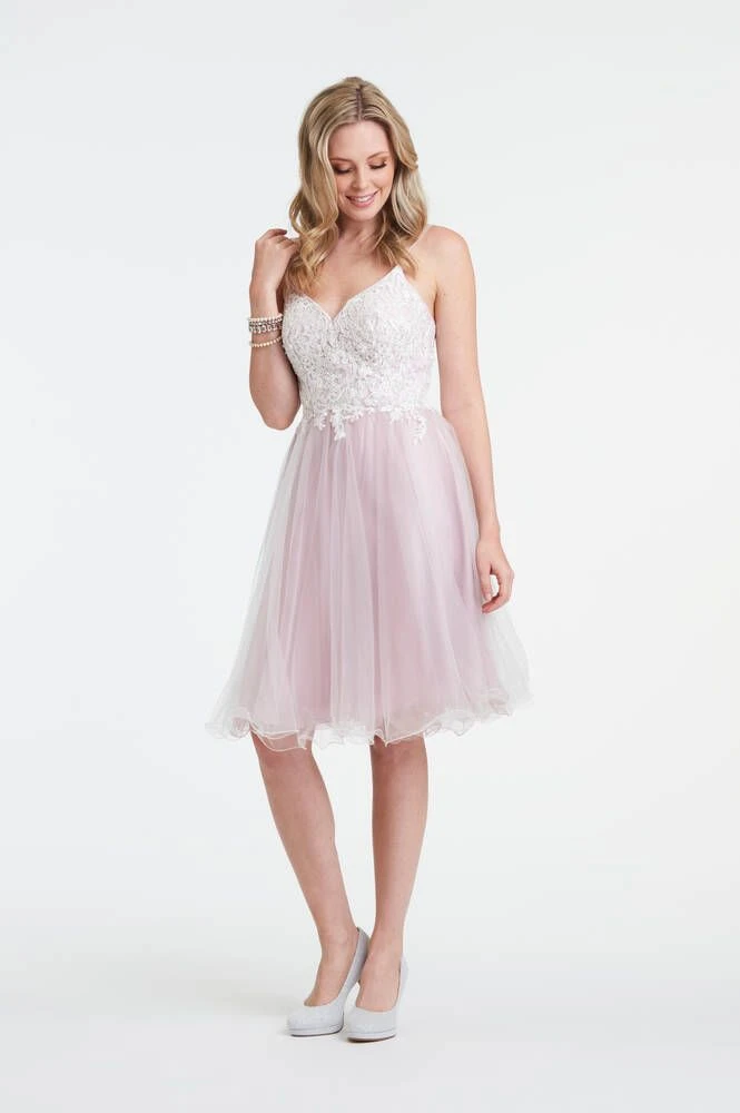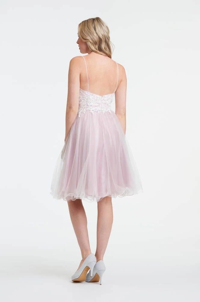 Naisten lyhyt tyllimekko pitsimäisesti koristellulla yläosalla. Mekossa on kapeat olkaimet ja helmaa kiertää siimakiristys.