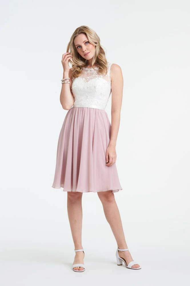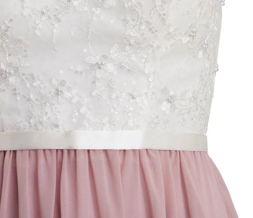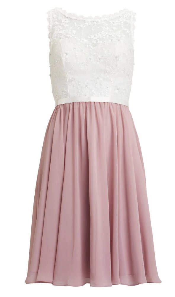 Kaksivärinen sifonkimekko upealla pitsimäisellä yläosalla ja selkäpuolen vetoketjukiinnityksellä. Yläosa on koristeltu helmi- sekä strassikoristein.