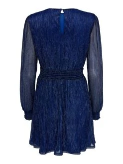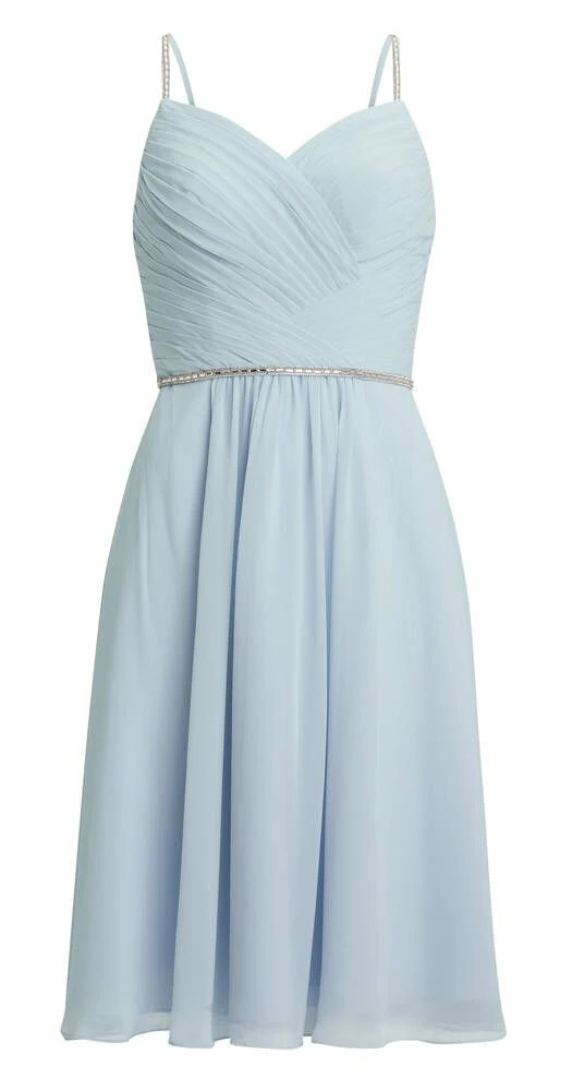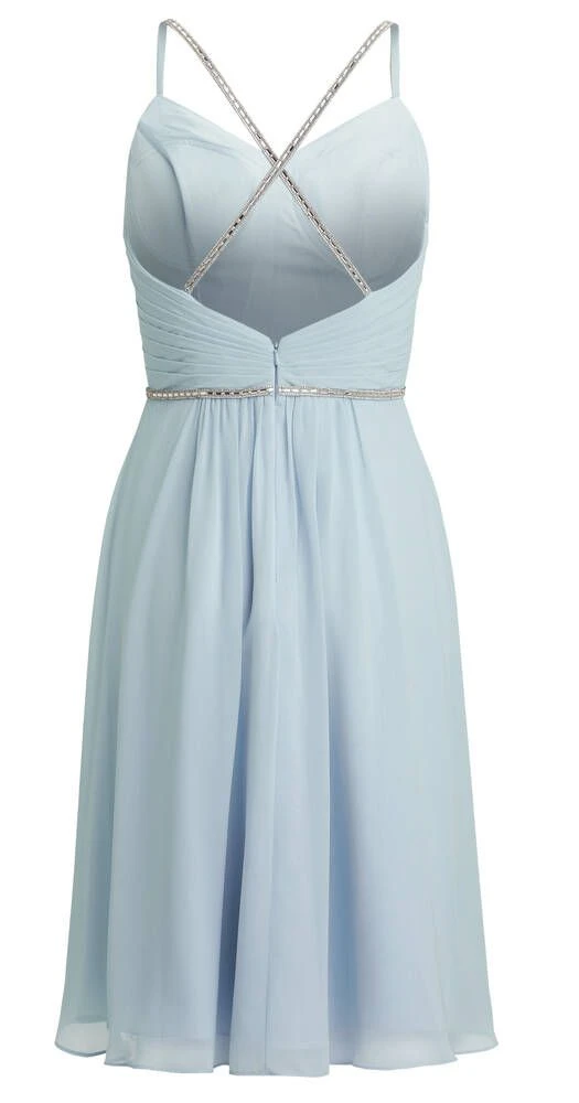 Yksivärinen sifonkimekko, jonka kapeat strassikoristellut olkaimet menevät selkäpuolelta tyylikkäästi ristiin. Vyötäröllä on kiiltävä koristepanta ja selkäpuolella pukemista helpottava vetoketjukiinnitys.