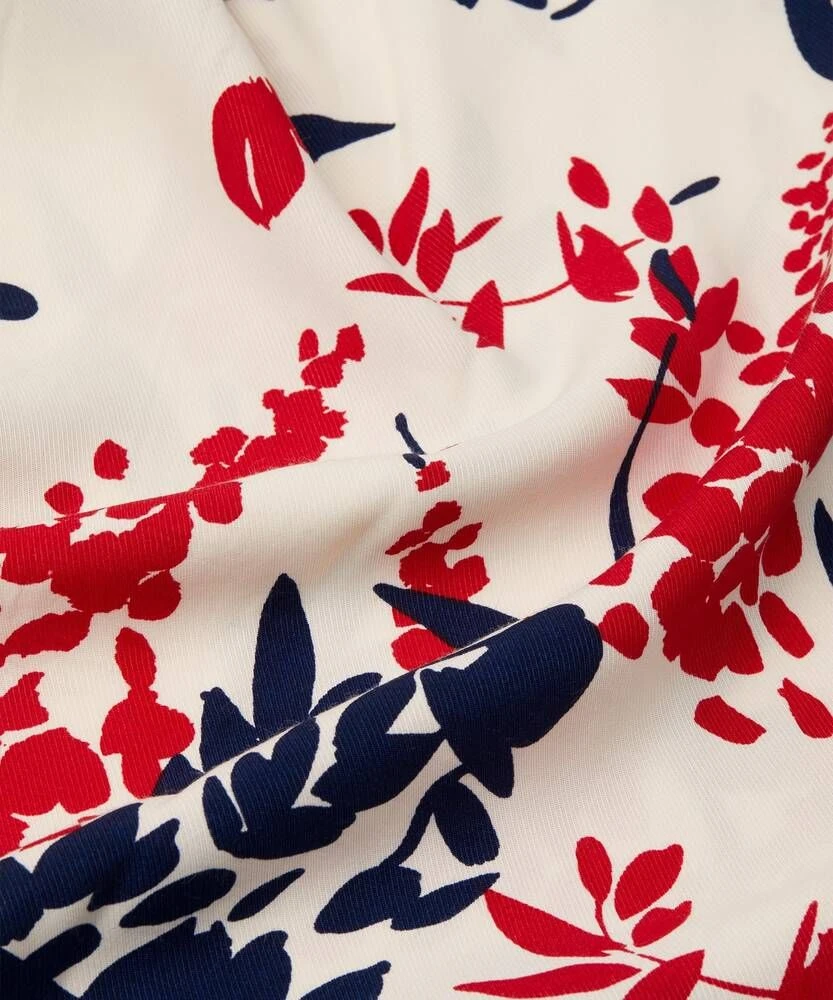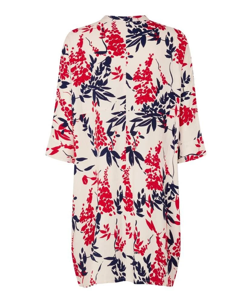 Naisten kukallinen mekko o-päänitellä ja vajaamittaisilla hihoilla. Mekossa on edessä piilonapitus alas asti.
