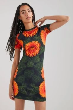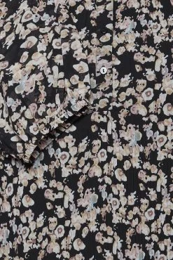 Naisten printillinen mekko kauluksilla ja napeilla. Mekossa on vyötäröllä rypistetty sauma.