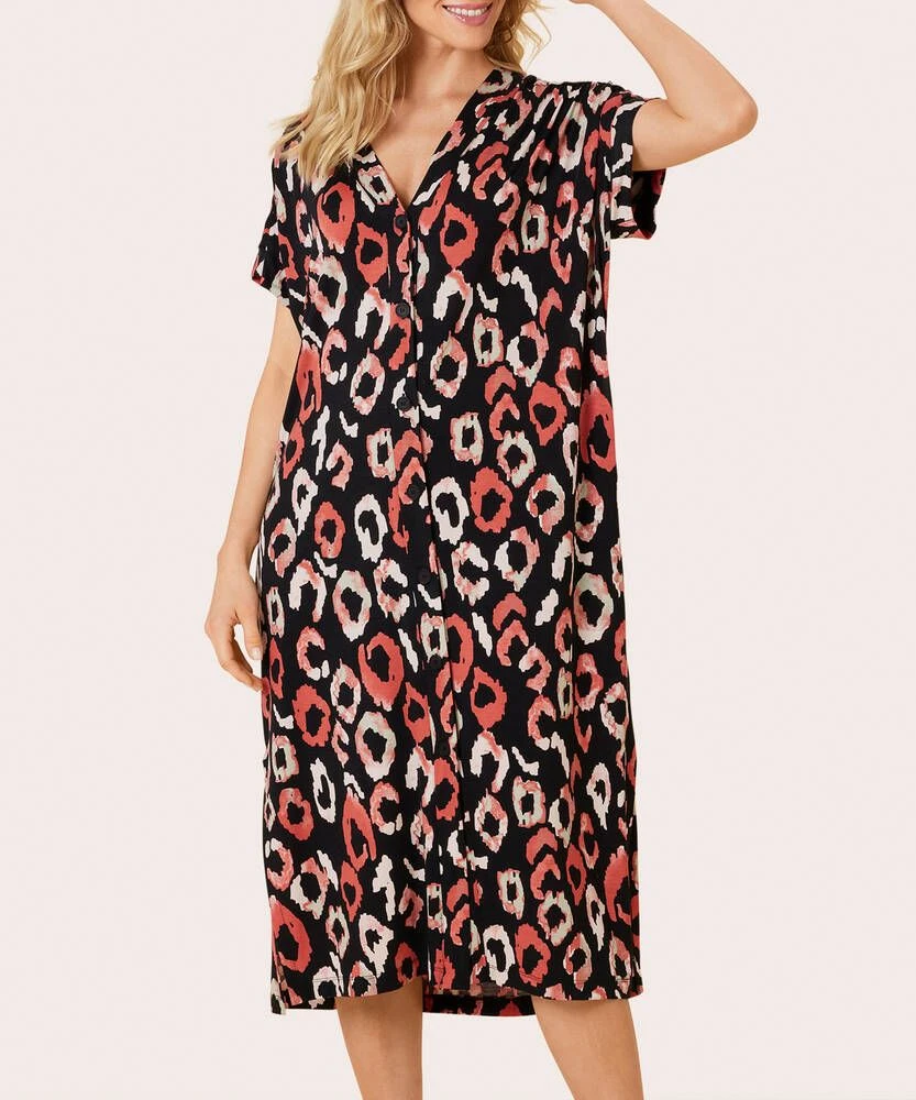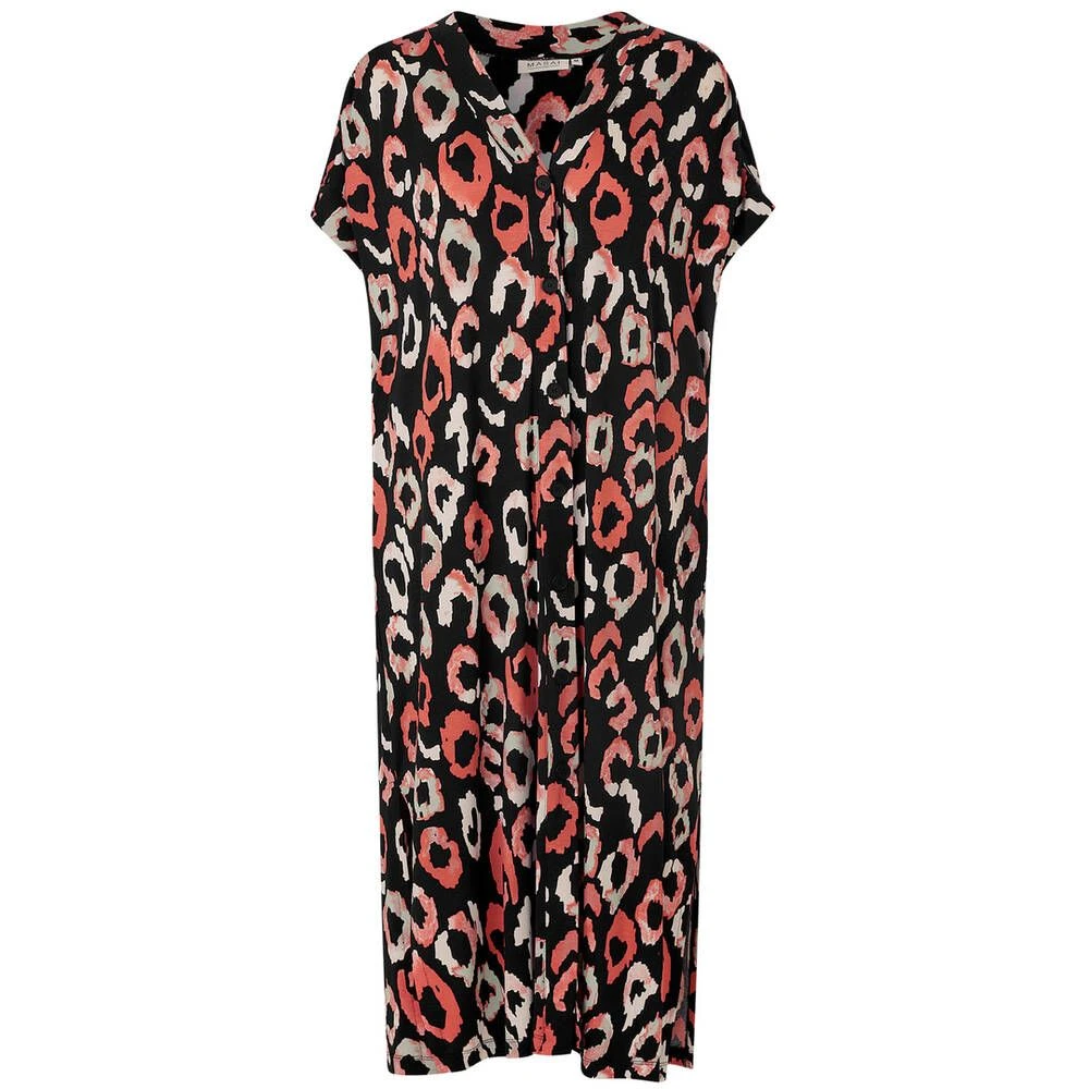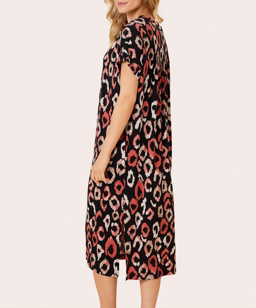 Naisten eläinkuosinen paitamekko V-pääntiellä ja lyhyillä hihoilla. Helmassa on naiselliset halkiot.