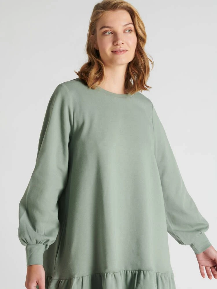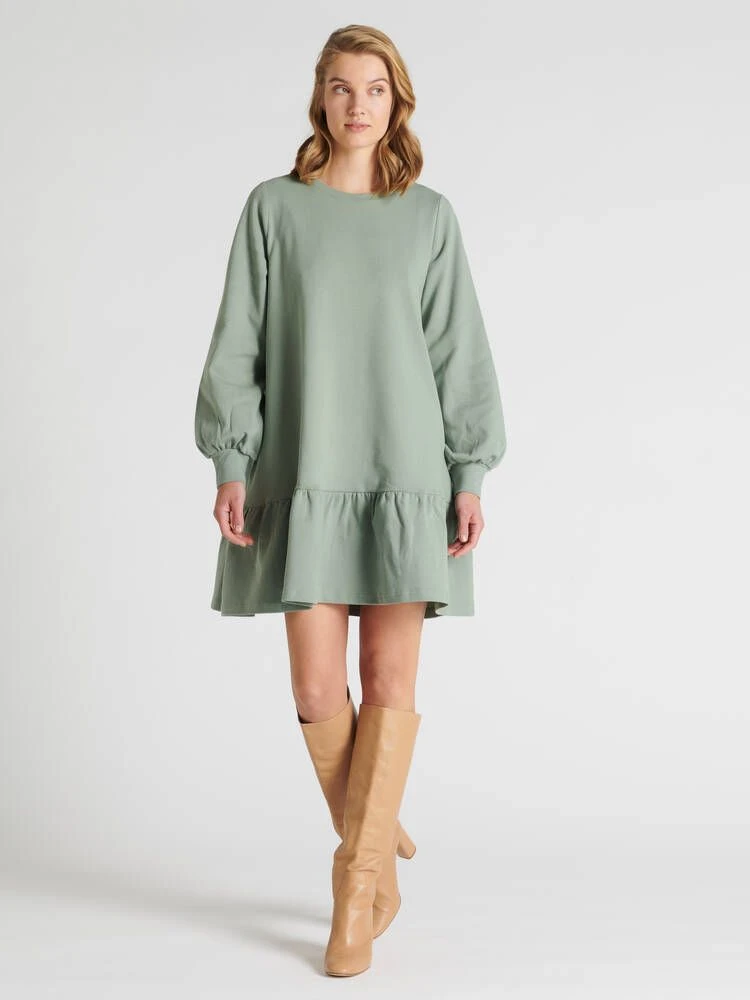Naisten rento Leija-mekko. Lyhyessä mekossa on pyöreä pääntie, sivuissa taskut, helmassa poimutus ja kauniisti hihansuihin poimuttuvat täyspitkät hihat. Mekon pituus olalta helmaan koossa M on noin 90 cm. Materiaali on miellyttävän tuntuista, paksumpaa interlock-neulosta.