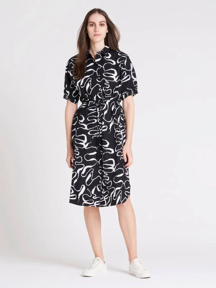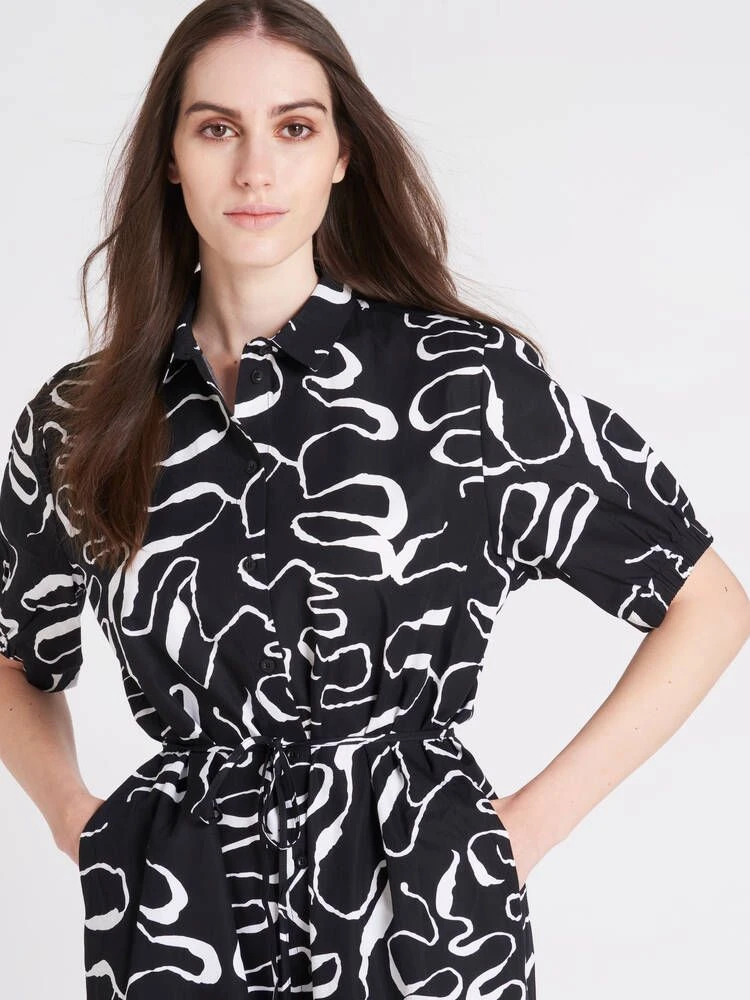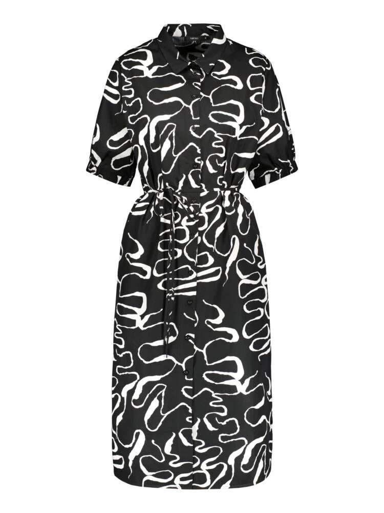 Naisten kuosillinen Marmori-mekko. Mekossa on klassinen kaulusmalli, napitus edessä, taskut sivuissa ja pyöristetty helma. Mekon vyötäröllä on kapea irroitettava vyö. Puseron 2/4-pituiset hihat poimuttuvat runsaasti hihansuun kuminauhakäänteen yläpuolelle. Mekon pituus olalta helmaan koossa 38 on noin 115 cm. Materiaali on kevyttä, mutta ryhdikästä puuvilla-popliinia. Materiaalille on ominaista 3-5% kutistuminen ensimmäisessä pesussa.