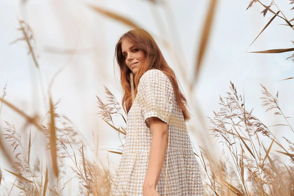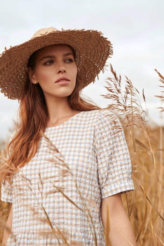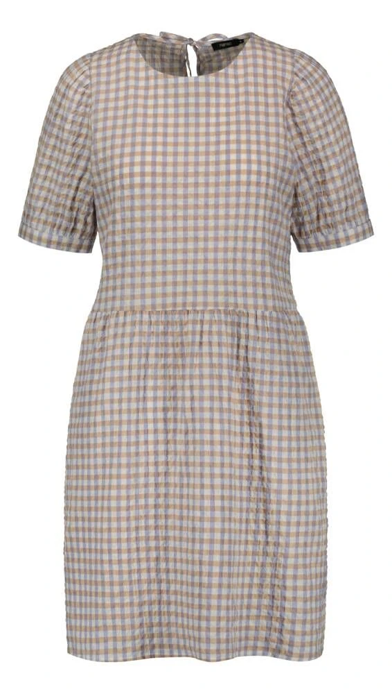 Naisten ruudullinen mekko. Mekossa on kantilla viimeistelty pyöreä pääntie, jonka takana halkiossa on solmimisnauhat. Mekossa on 2/4- hihat, jotka poimuttuvat hihansuun napeilla säädettävän listan yläpuolella ja olalla. Mekon helma poimuttuu kauniisti vyötäröllä ja sivuissa on taskut. Materiaali on kauniisti laskeutuvaa keveää ja struktuuripintaista puuvillaa, jossa on hieman elastaania mukana.