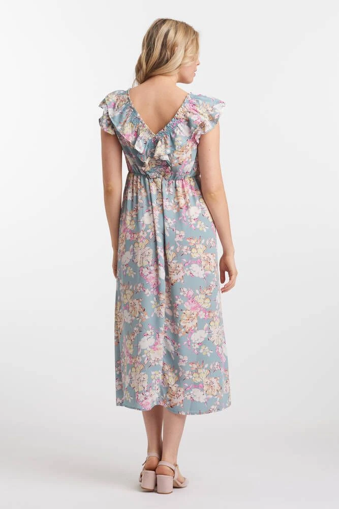 Naisten nilkkapituinen kukkamekko, jonka pääntiellä on ihanat röyhelöt sekä solmittavat nauhat.