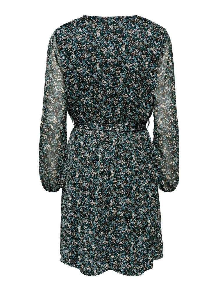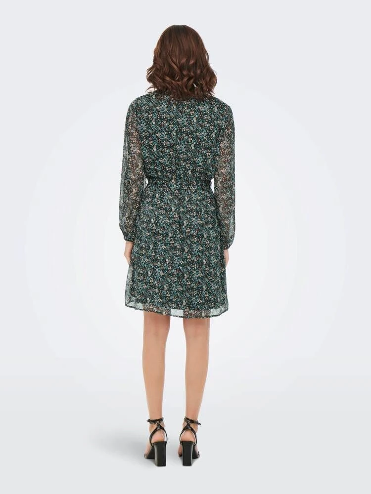 Naisten kuviollinen sifonkimekko pitkillä hihoilla. Mekossa on kangasvyö, jonka voi solmia rusetille.