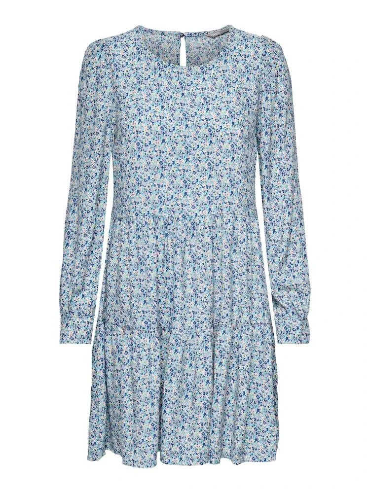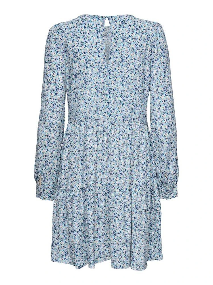 Ihana viskoosimekko pitkillä hihoilla ja pienellä raikkaalla kukkakuosilla. Niskassa on pukemista helpottava nappikiinnitys. A-linjaisen mekon helmassa on poikkisaumat rypytyksillä.