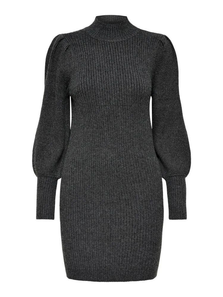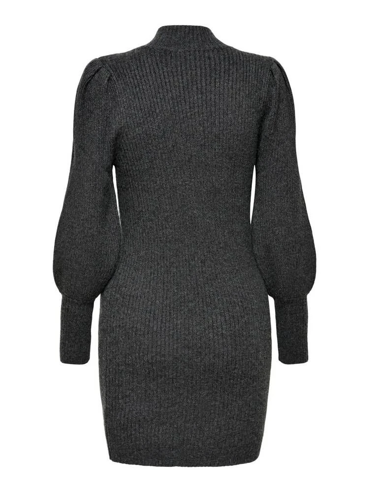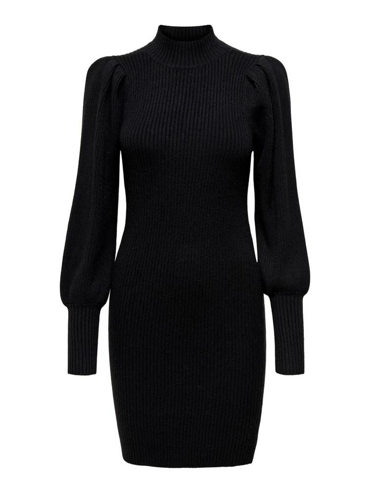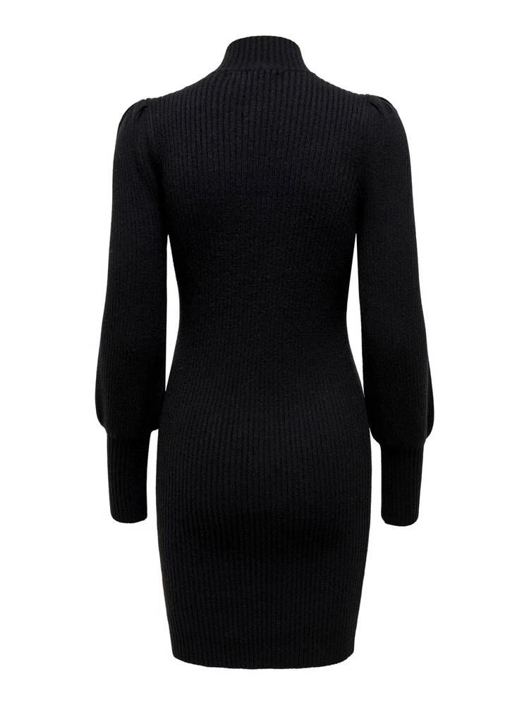 Naisten lyhyt neulemekko puolipoolokauluksella ja pitkillä hihoilla.