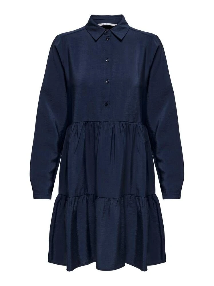 Naisten mekko puolinapituksella ja kauluksilla. Mekossa on rypytetty helmasauma.