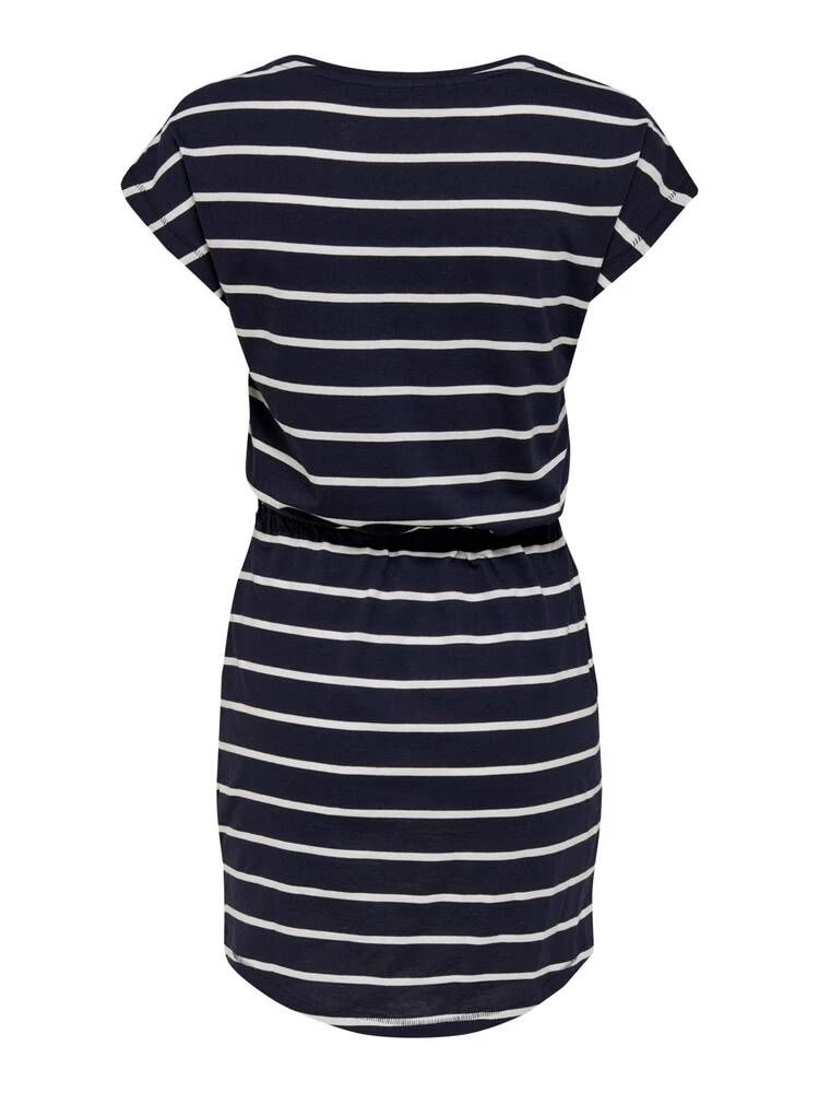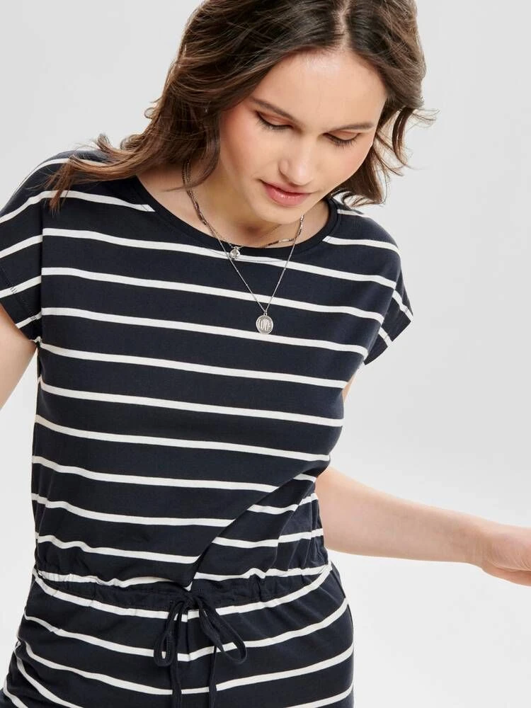 Rento raidallinen trikoomekko lyhyillä holkkihihoilla ja vyötärön muotoa antavalla kiristysnauhalla.