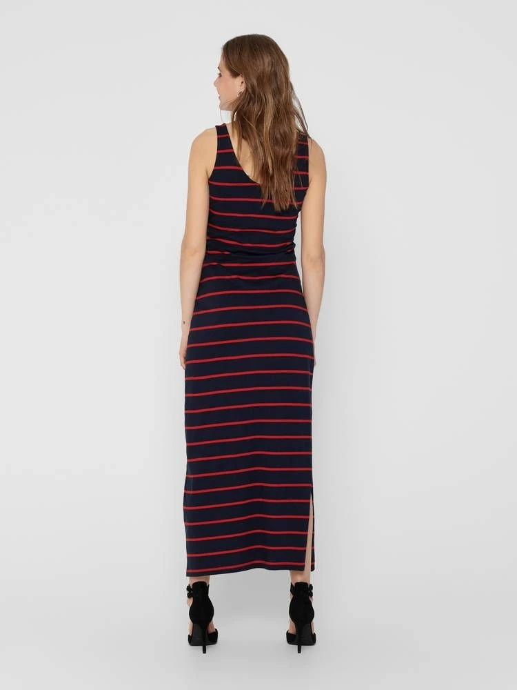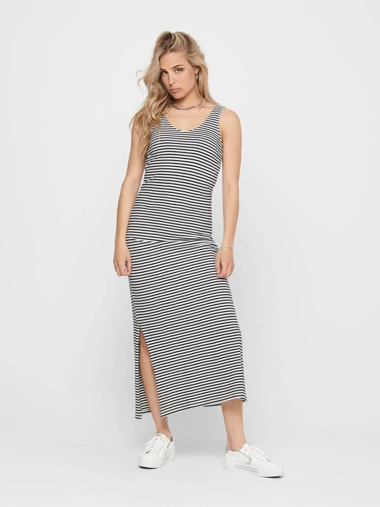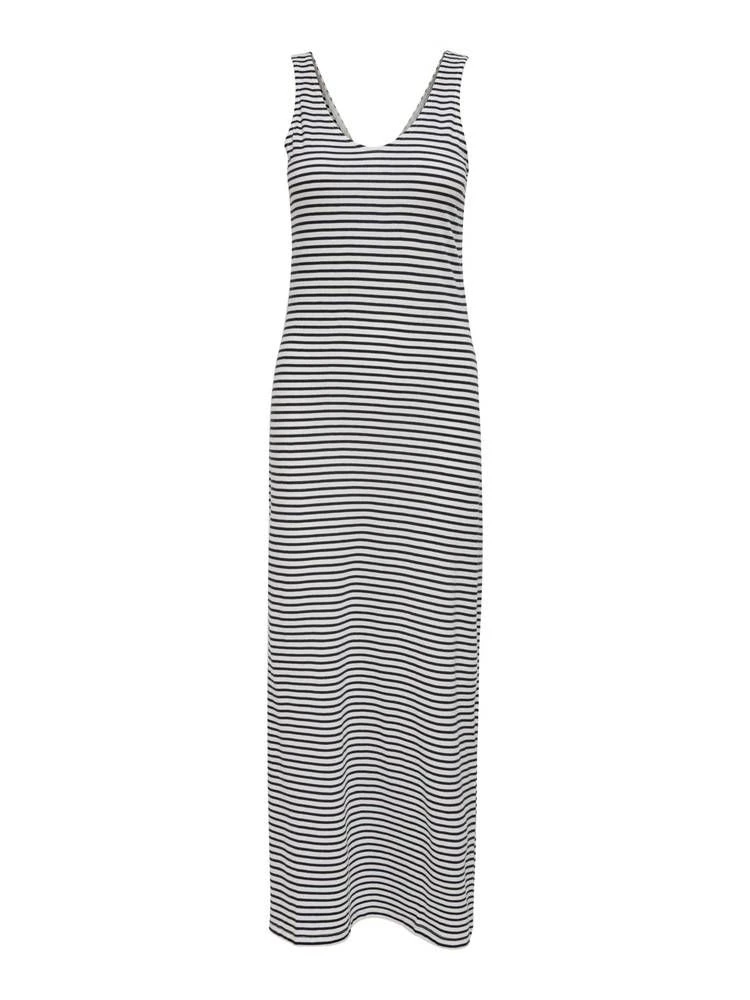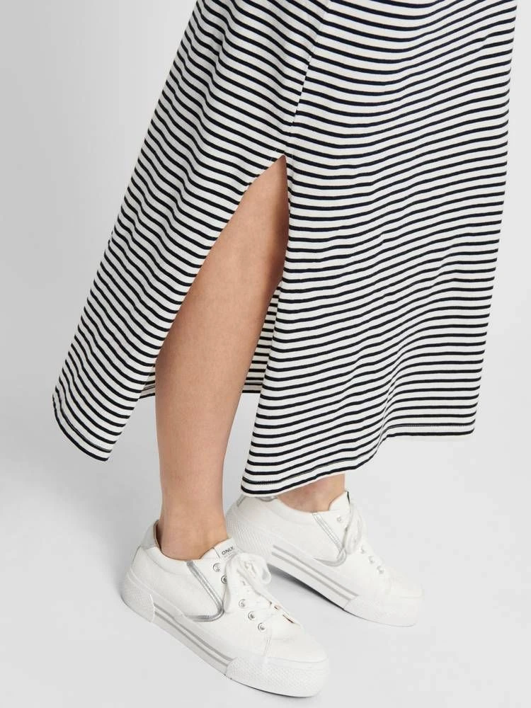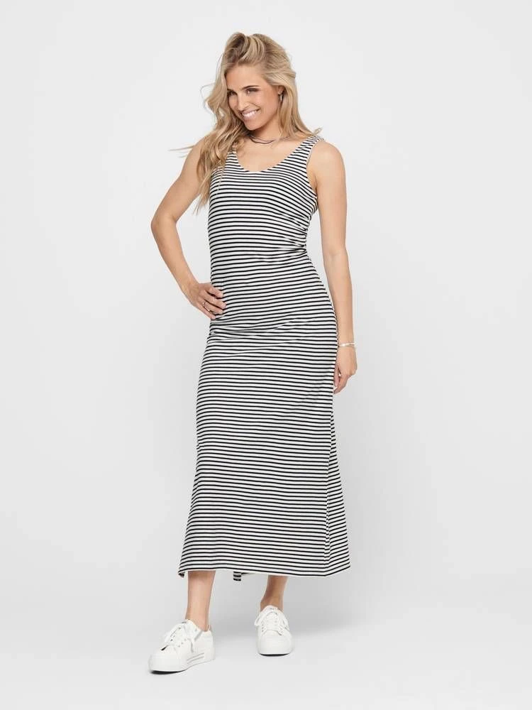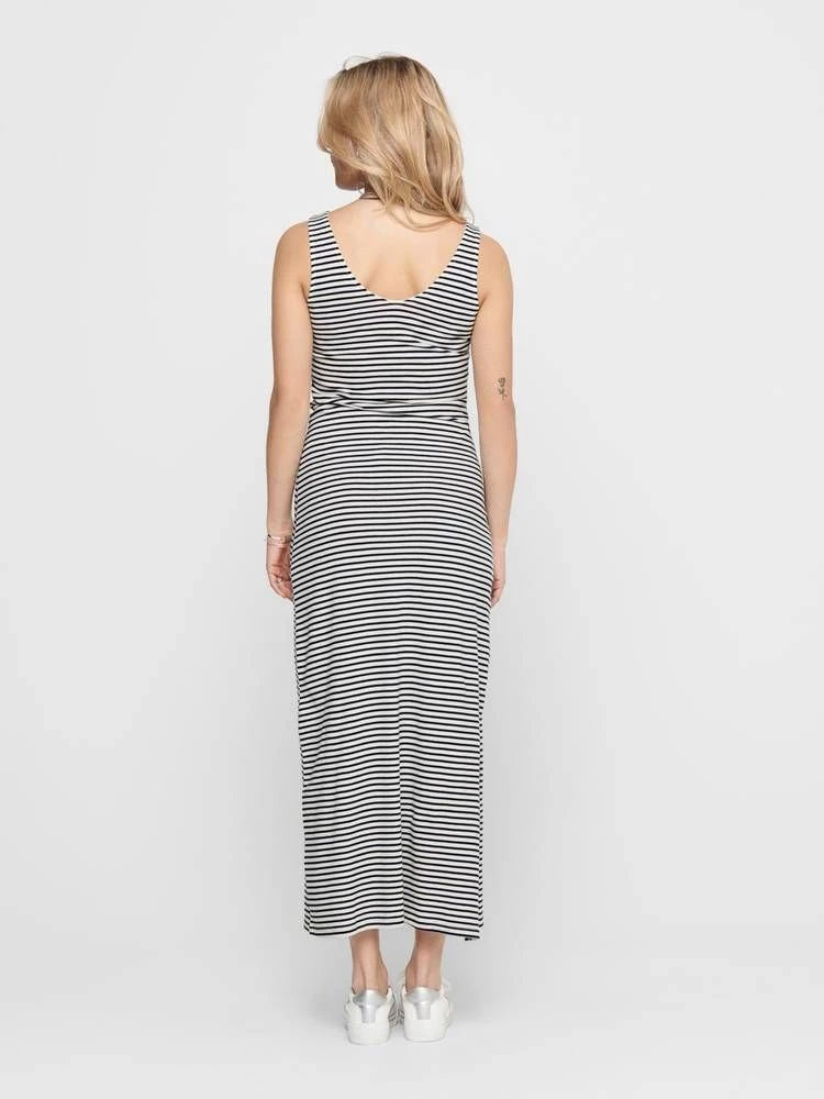 Pitkä raidallinen trikoomekko, joka on valmistettu ekologisesta luomupuuvillasta.