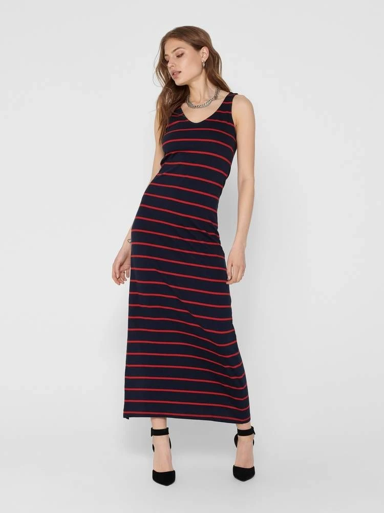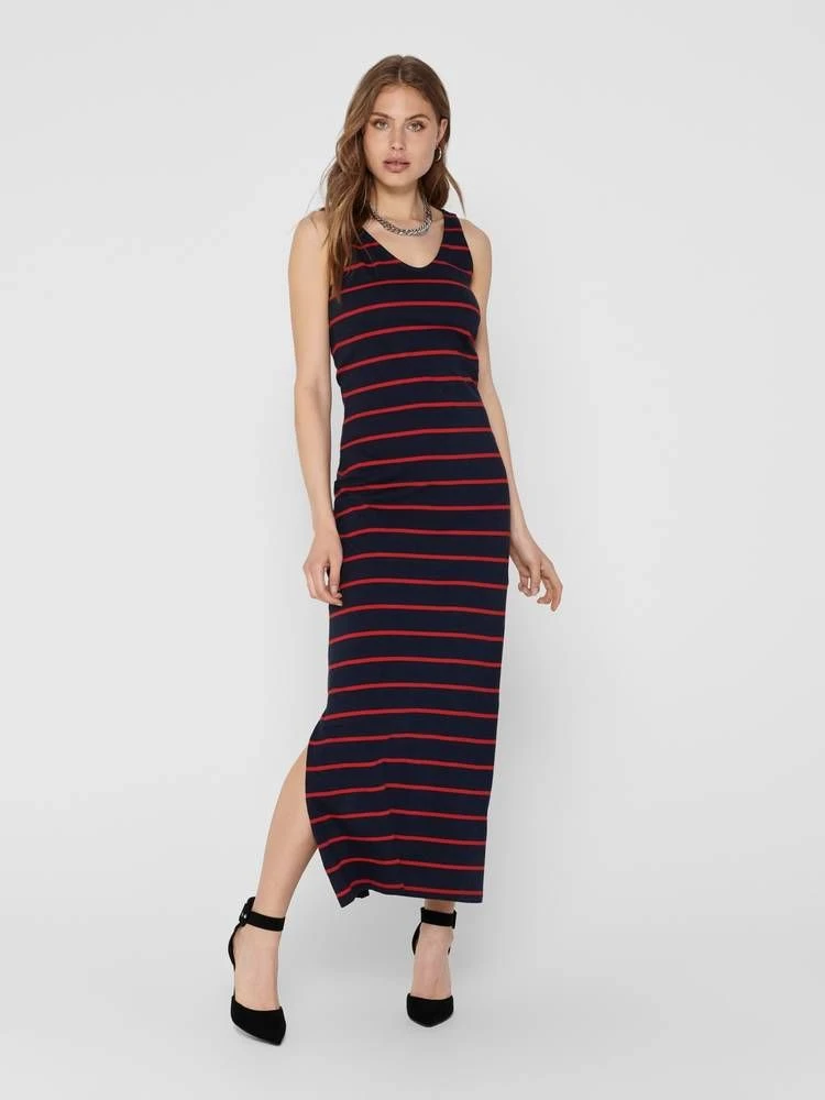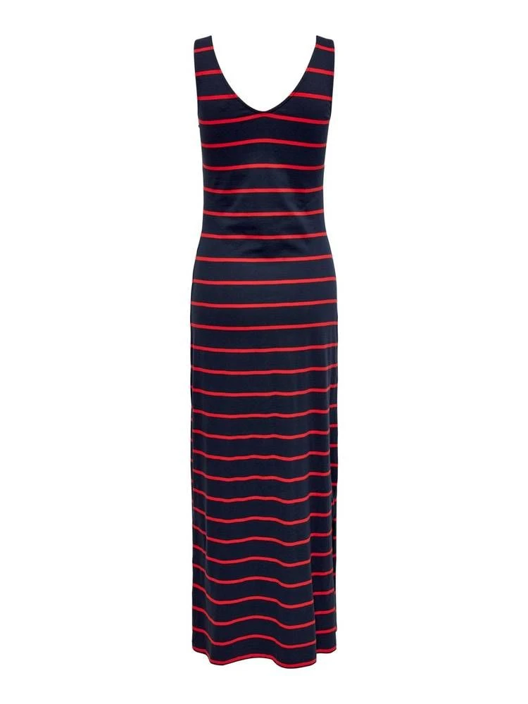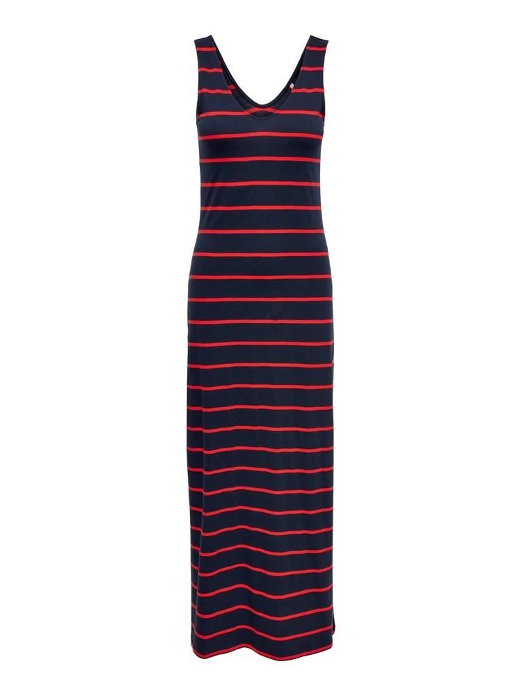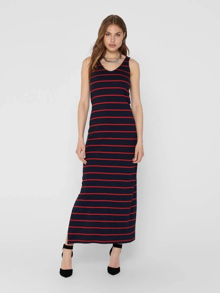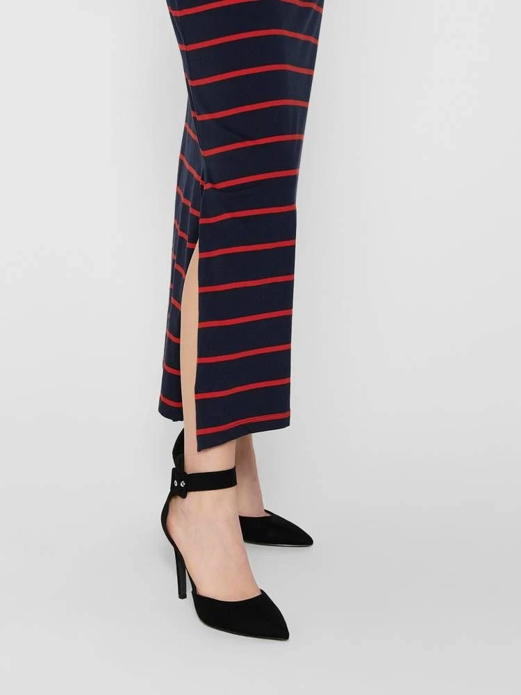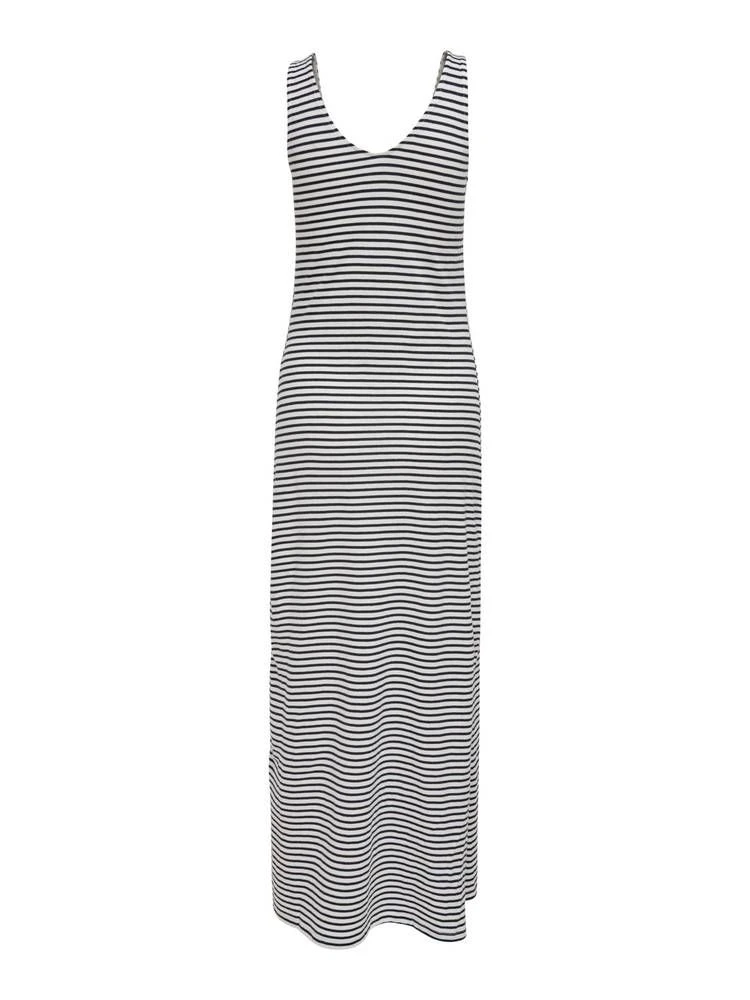 Pitkä raidallinen trikoomekko, joka on valmistettu ekologisesta luomupuuvillasta.