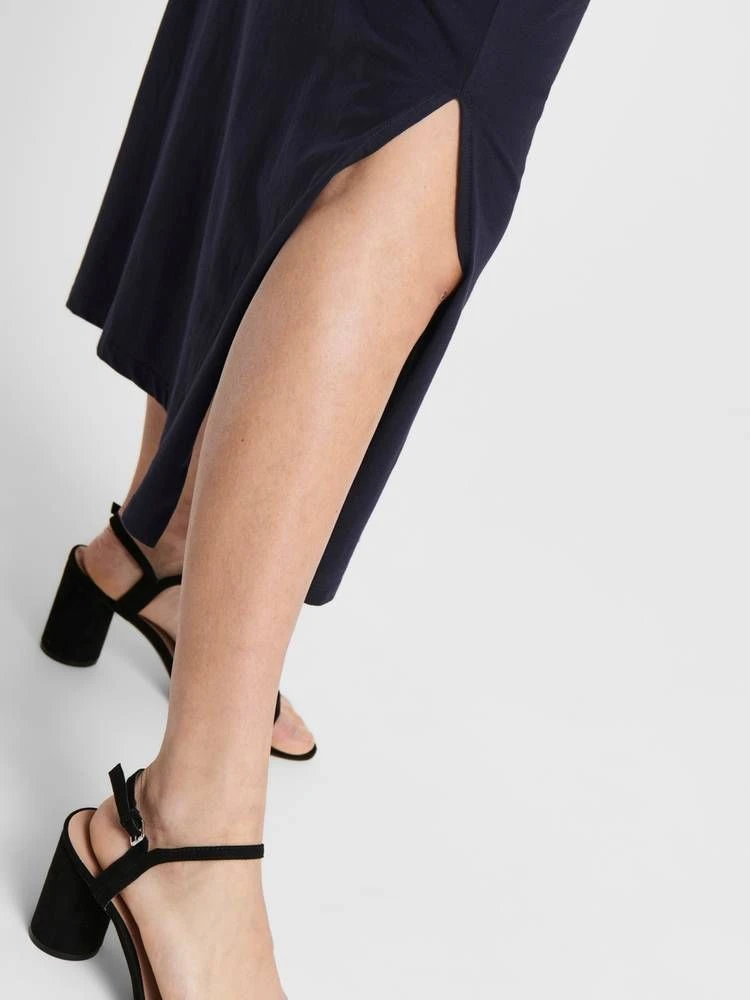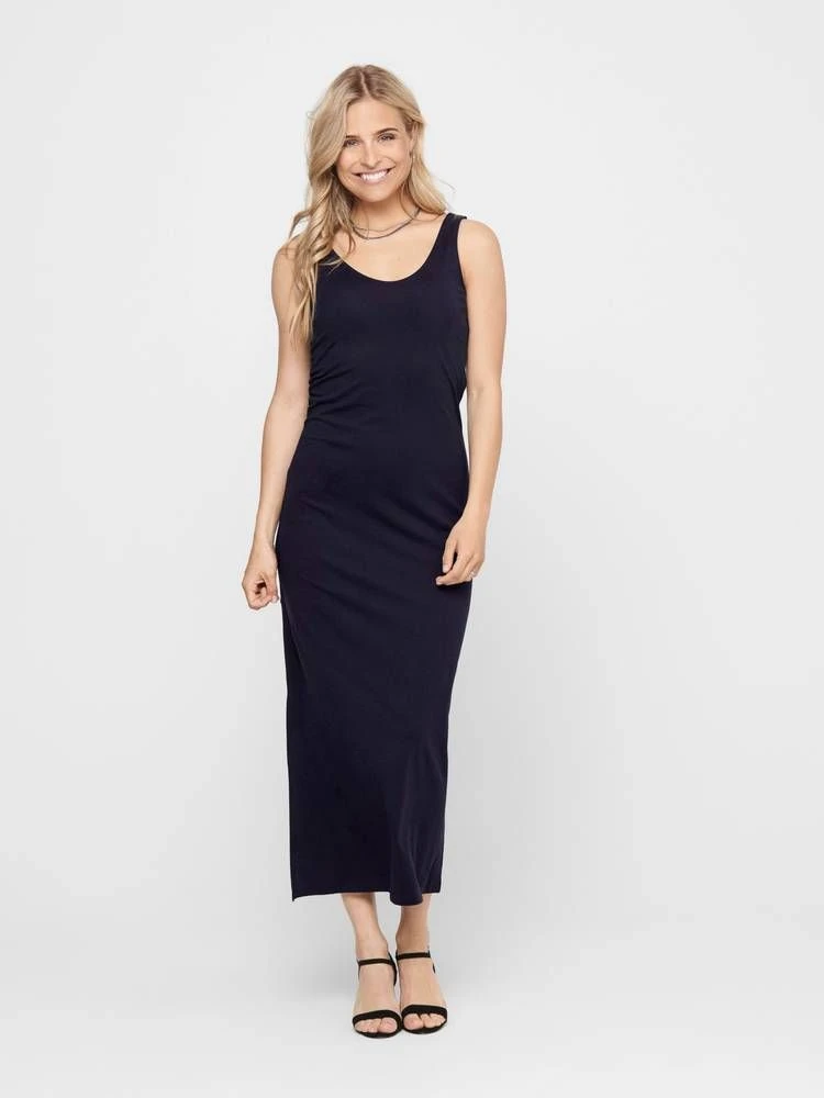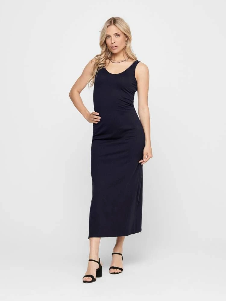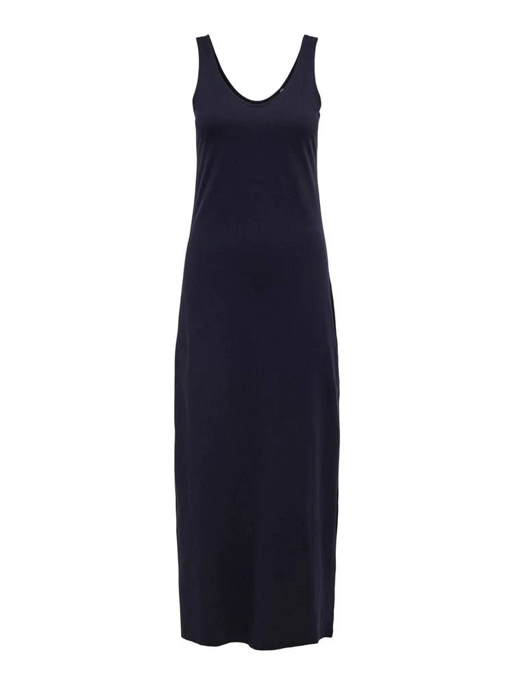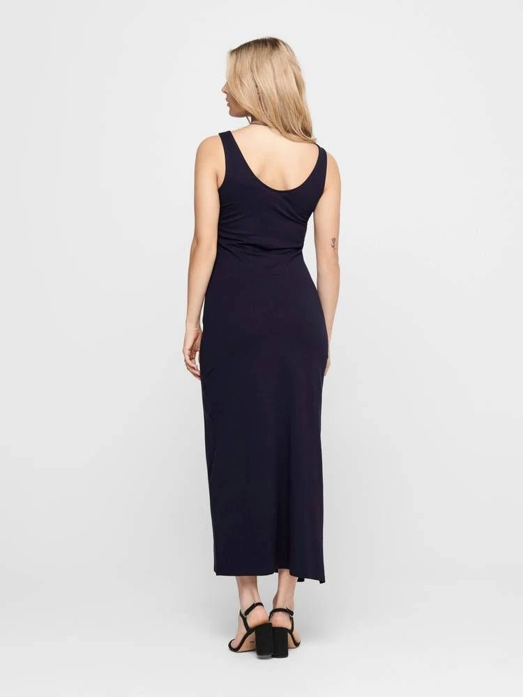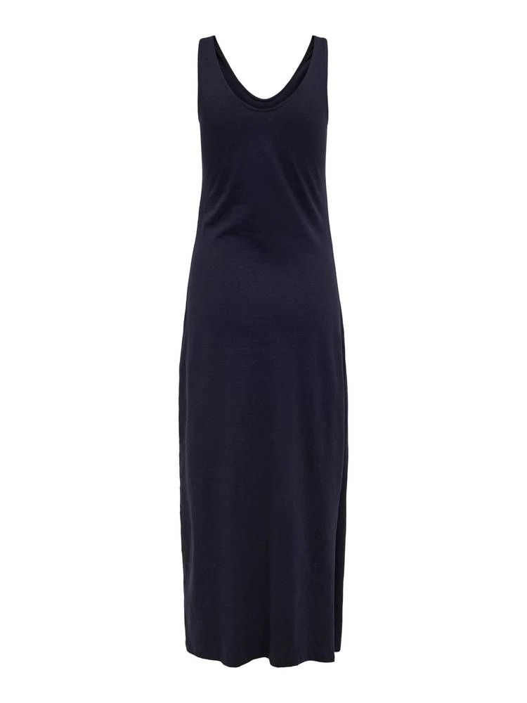 Pitkä raidallinen trikoomekko, joka on valmistettu ekologisesta luomupuuvillasta.