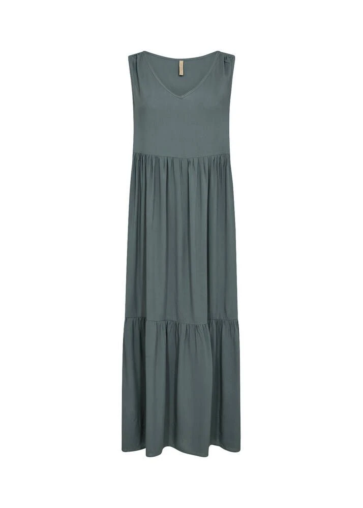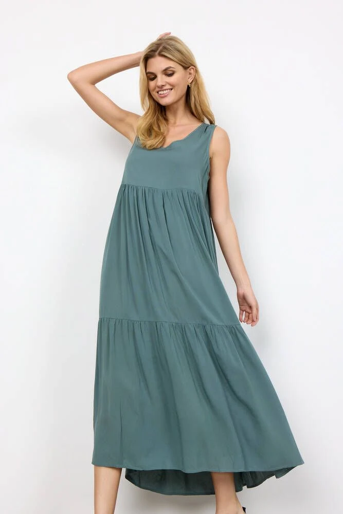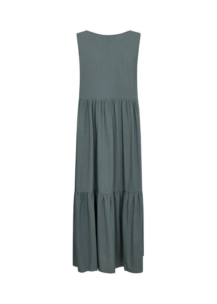 Naisten hihaton midimekko rypytetyillä helmasaumoilla.