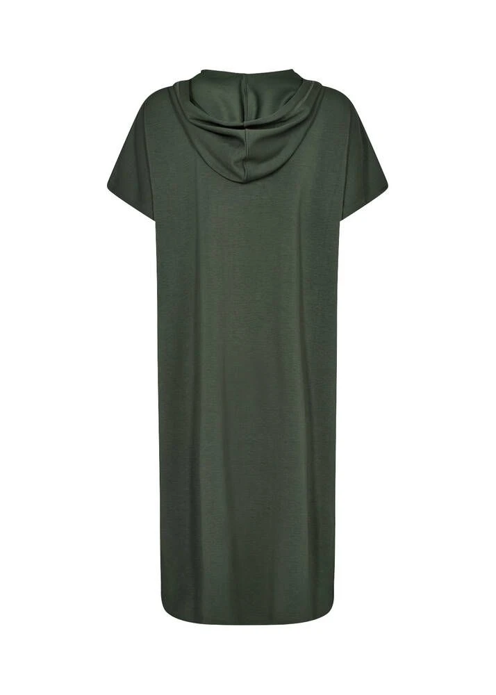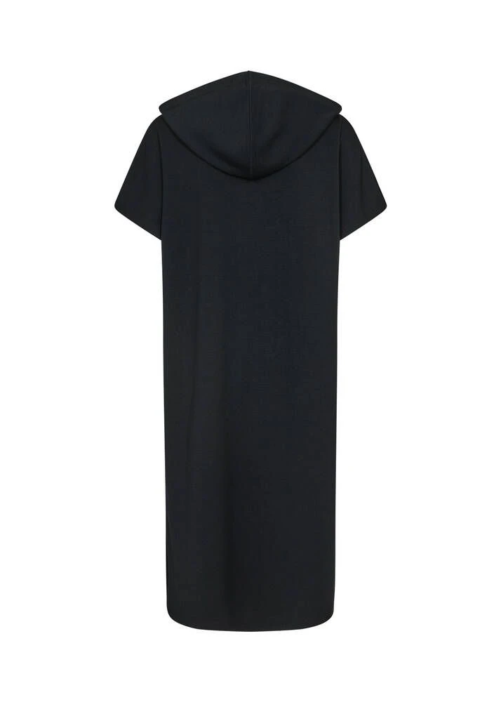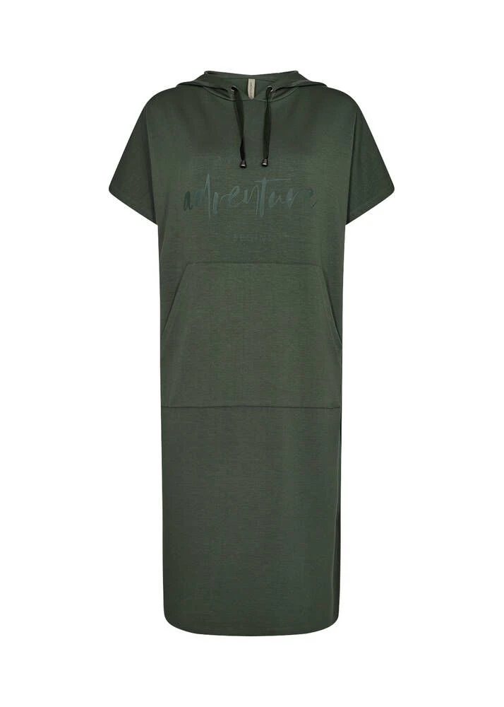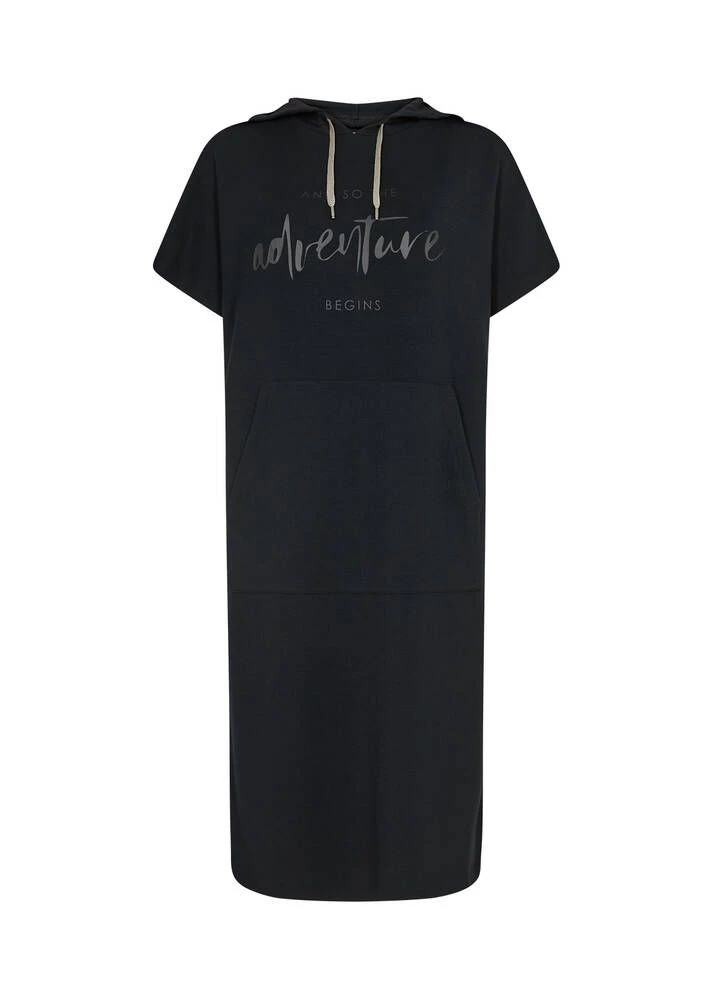 Naisten rento midipituinen collegemekko tekstiprintillä. Lasketut olkasaumat ja kengurutasku lisäävät mekon rentoa fiilistä.