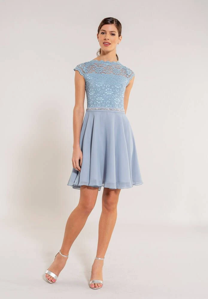 Pastellisävyinen mekko kauniilla pitsisellä yläosalla ja sifonkisella kellohelmalla. Vyötäröllä on kapea ja kimalteleva glitterpanta ja selkäpuolella pukemista helpottava vetoketjukiinnitys.