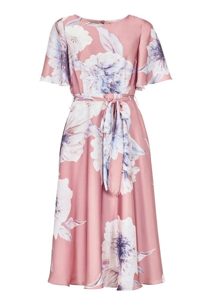 Naisten näyttävä satiinimekko lyhyillä ja leveillä hihoilla sekä klassisella kukkakuosilla. Vyötäröllä on solmittava nauhavyö.