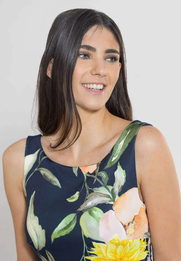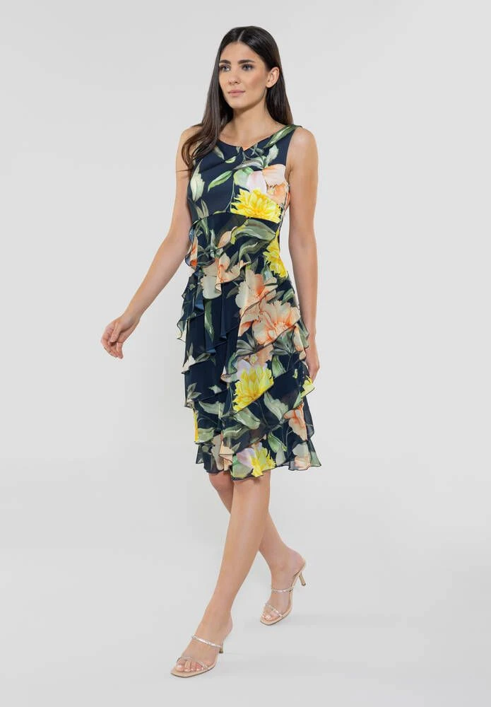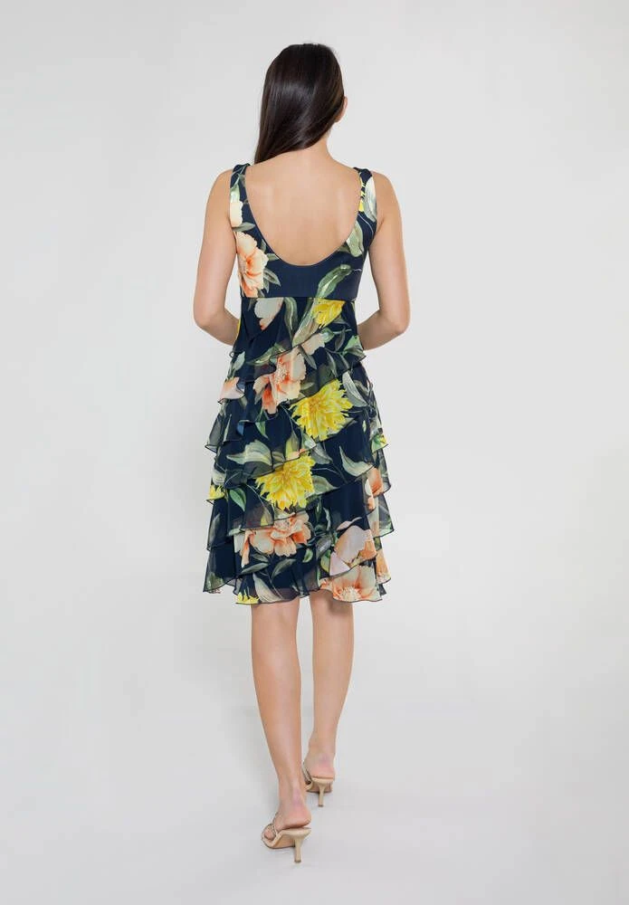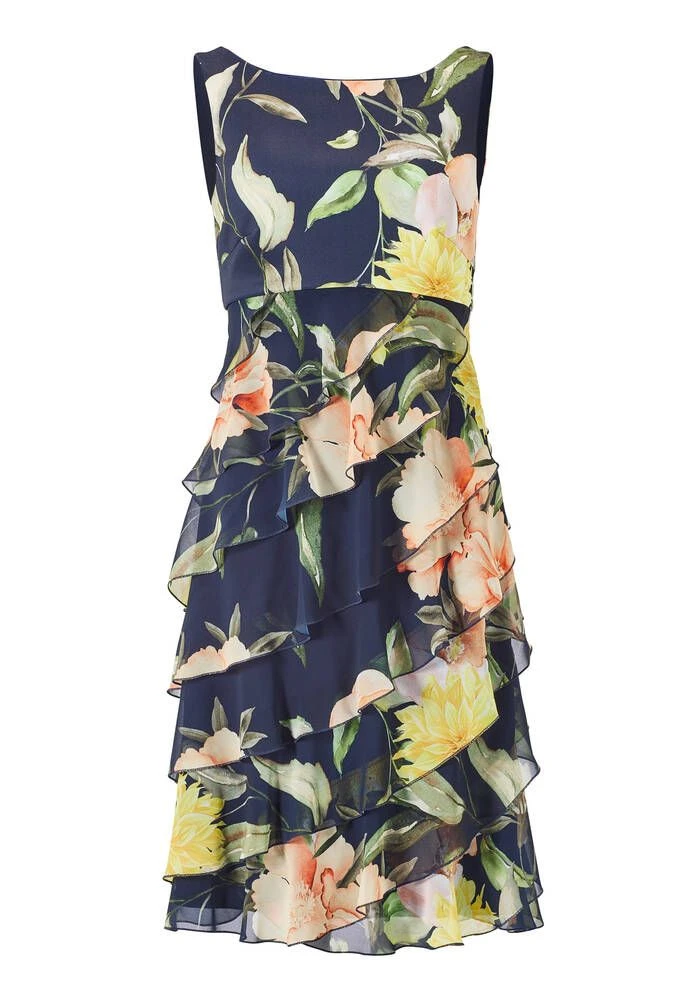 Naisten ihana cocktailmekko kerrostetulla sifonkihelmalla. Pääntie on selkäpuolelta uurrettu V-aukoksi. Kaunis kukkakuosi viimeistelee kokonaisuuden.